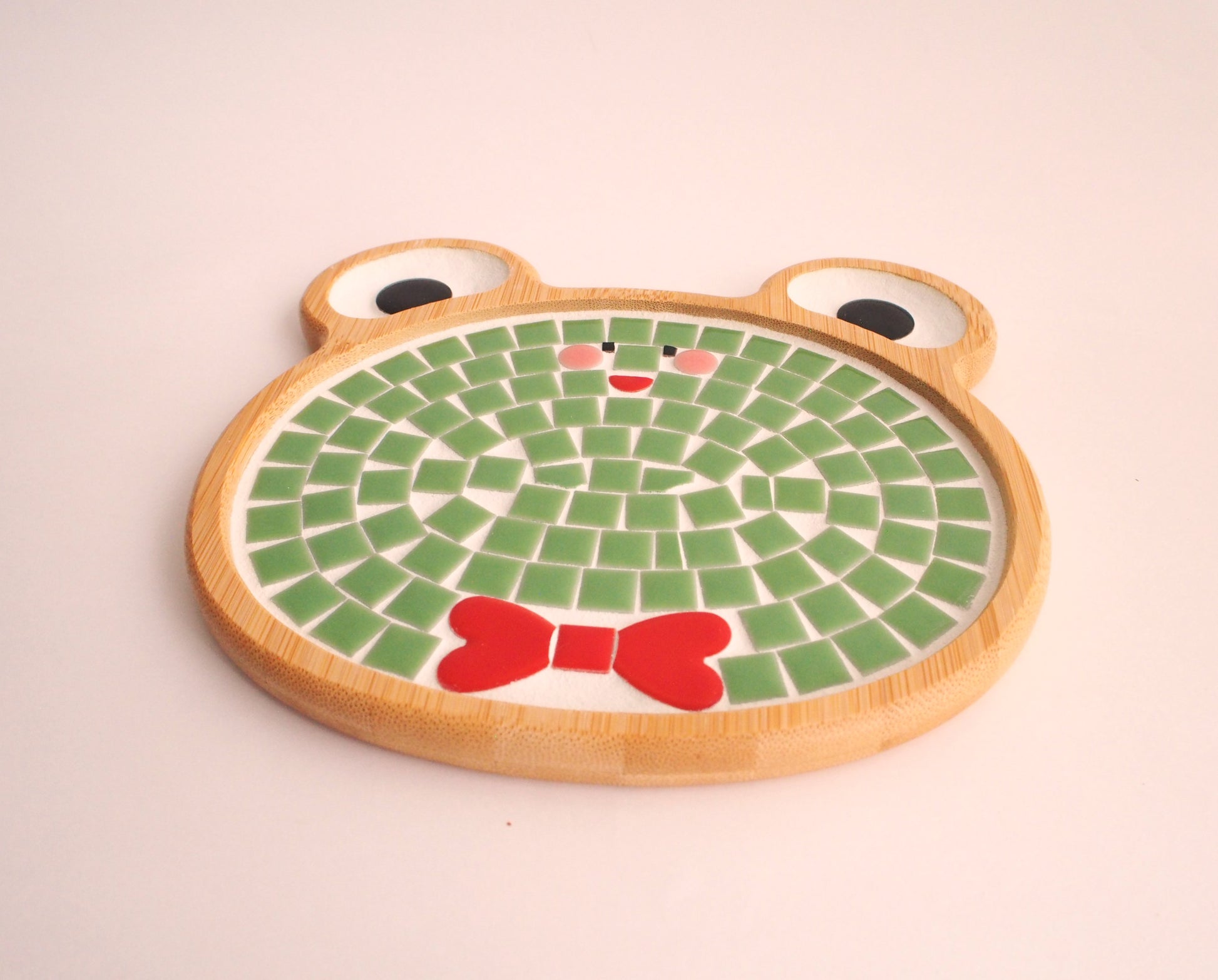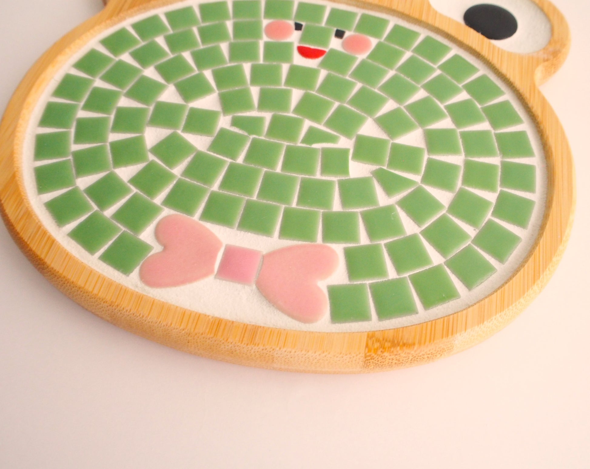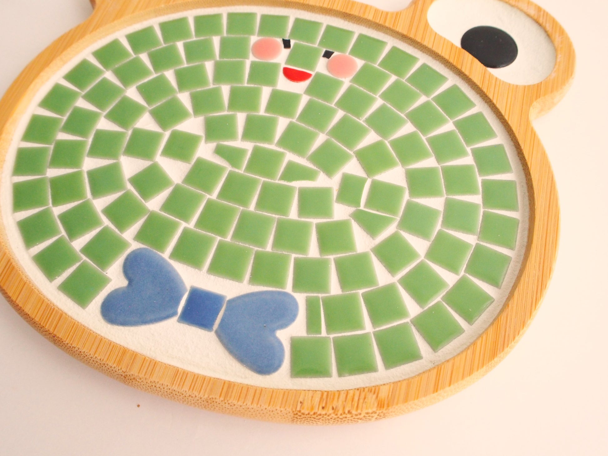 Chobo's tile art goods are made by hand, gluing tiles one by one and filling in the gaps. Tiles may be cut to create a design, so the arrangement of tiles may vary from piece to piece.