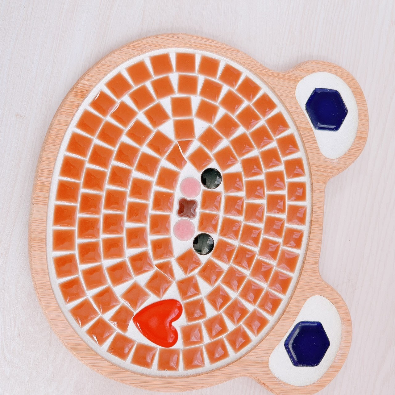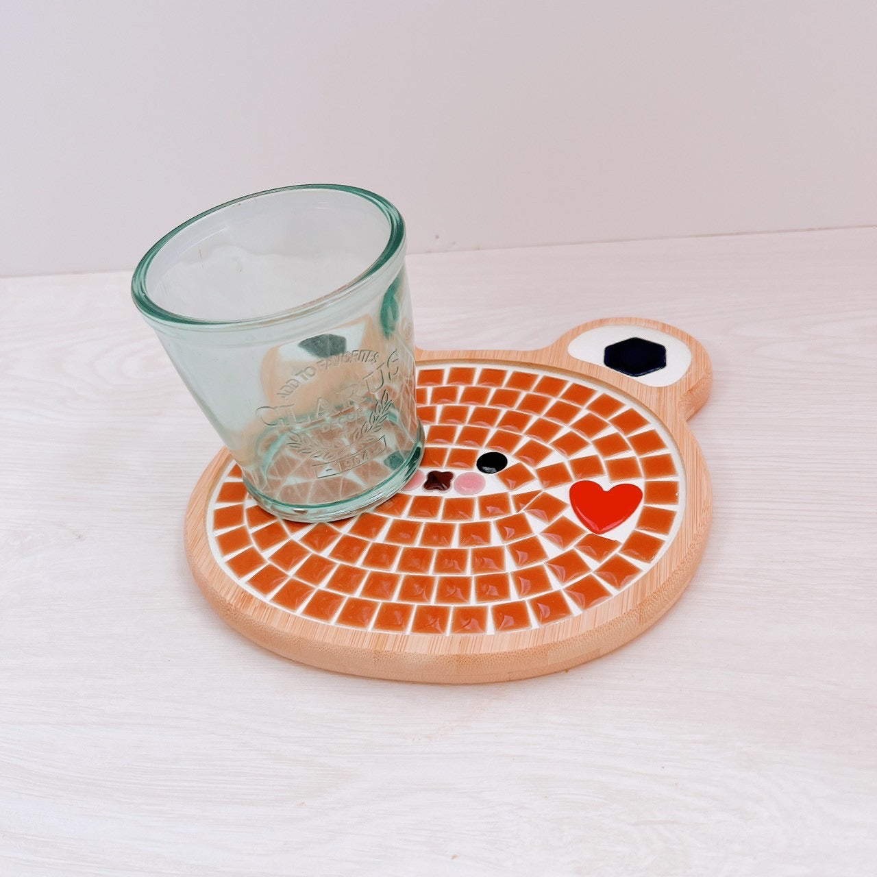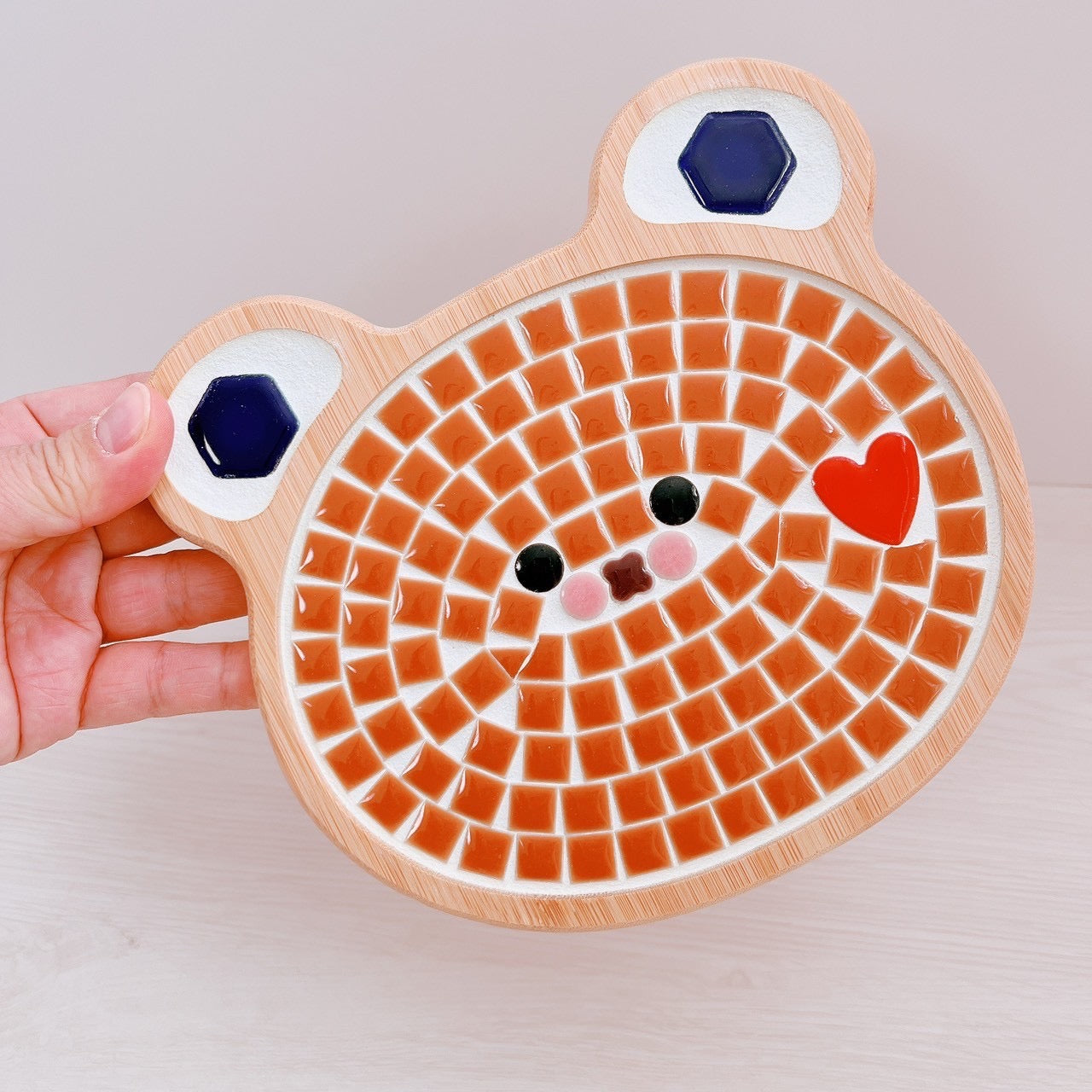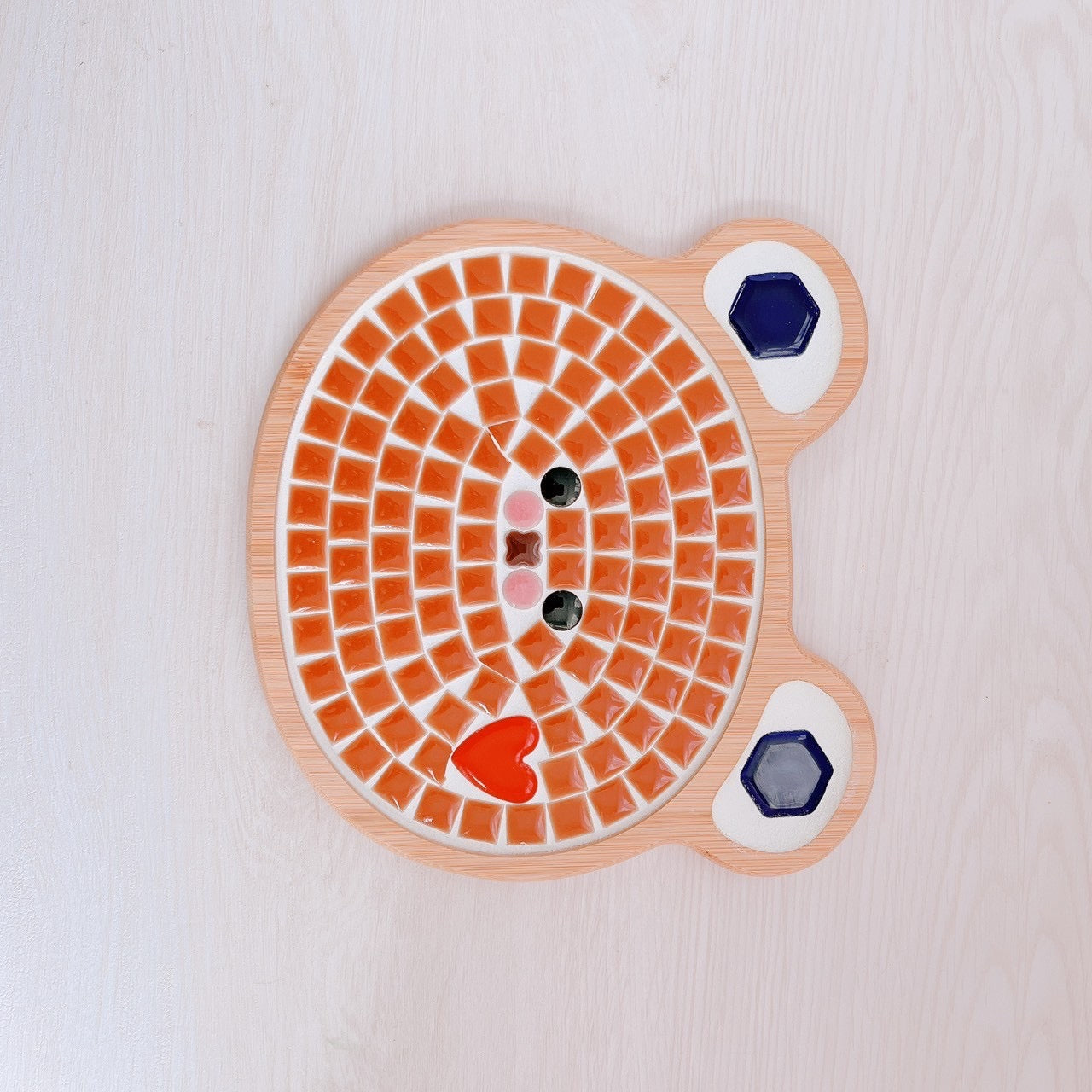 こちらはタイルアートくま鍋敷きです。耳は六角タイルを使い、顔は赤茶色でクマらしくデザインしました。可愛くて鍋を置けないよと言う方は、カップやお菓子を置くプレートとしてご使用下さい。