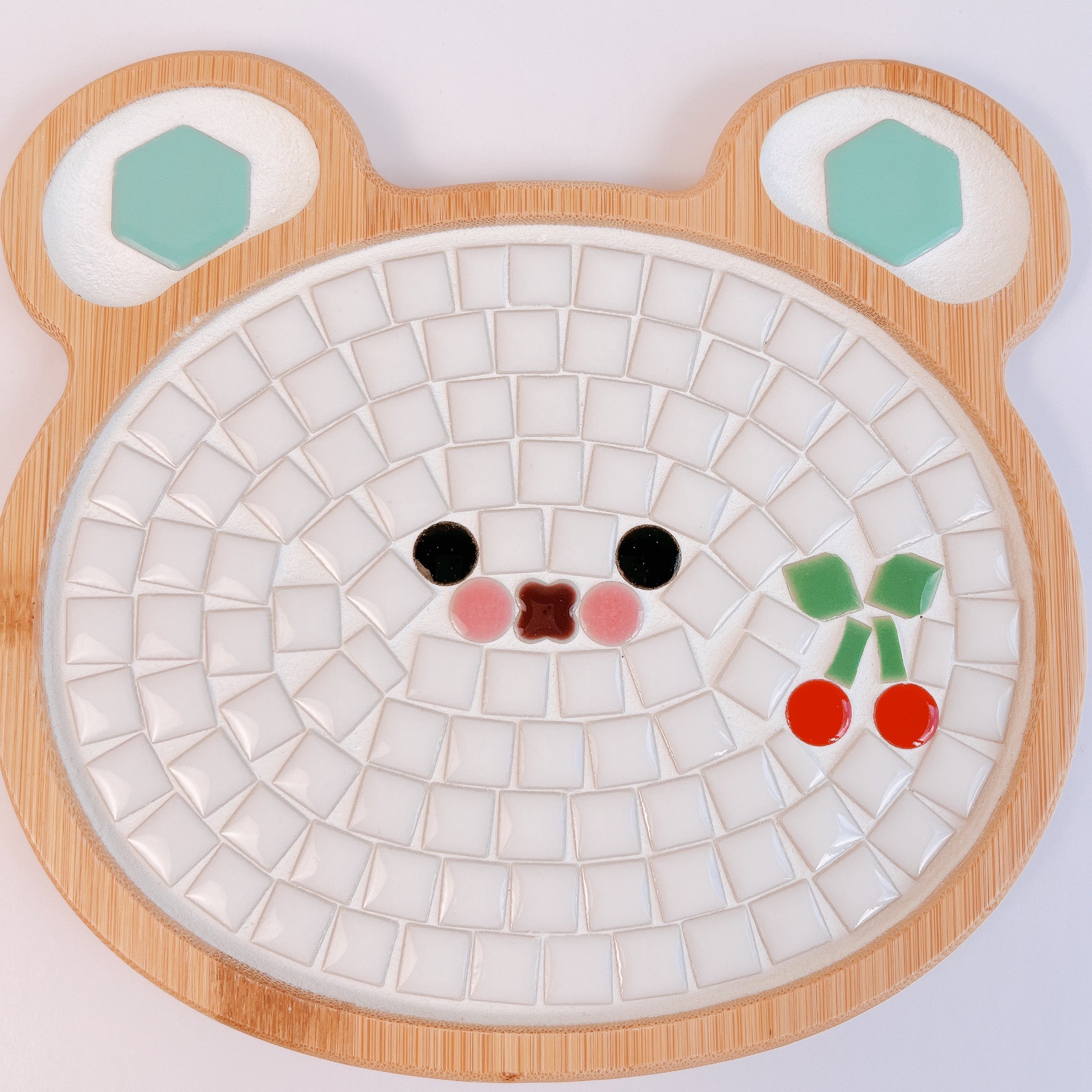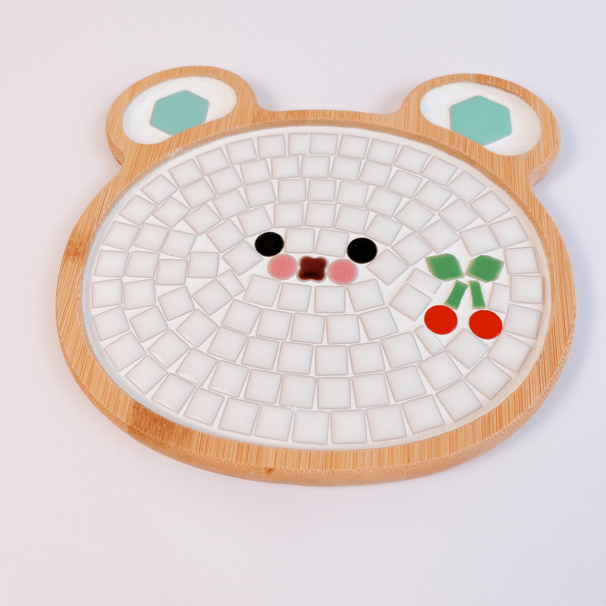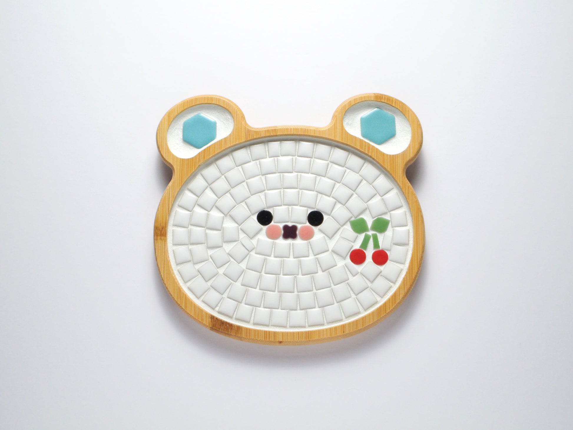 This is a tile art bear trivet. The ears are made of hexagonal tiles, the face is white, and there are cherries on the cheeks as an accent. If you think it's too cute to put a pot on, you can use it as a plate to put cups or sweets on.