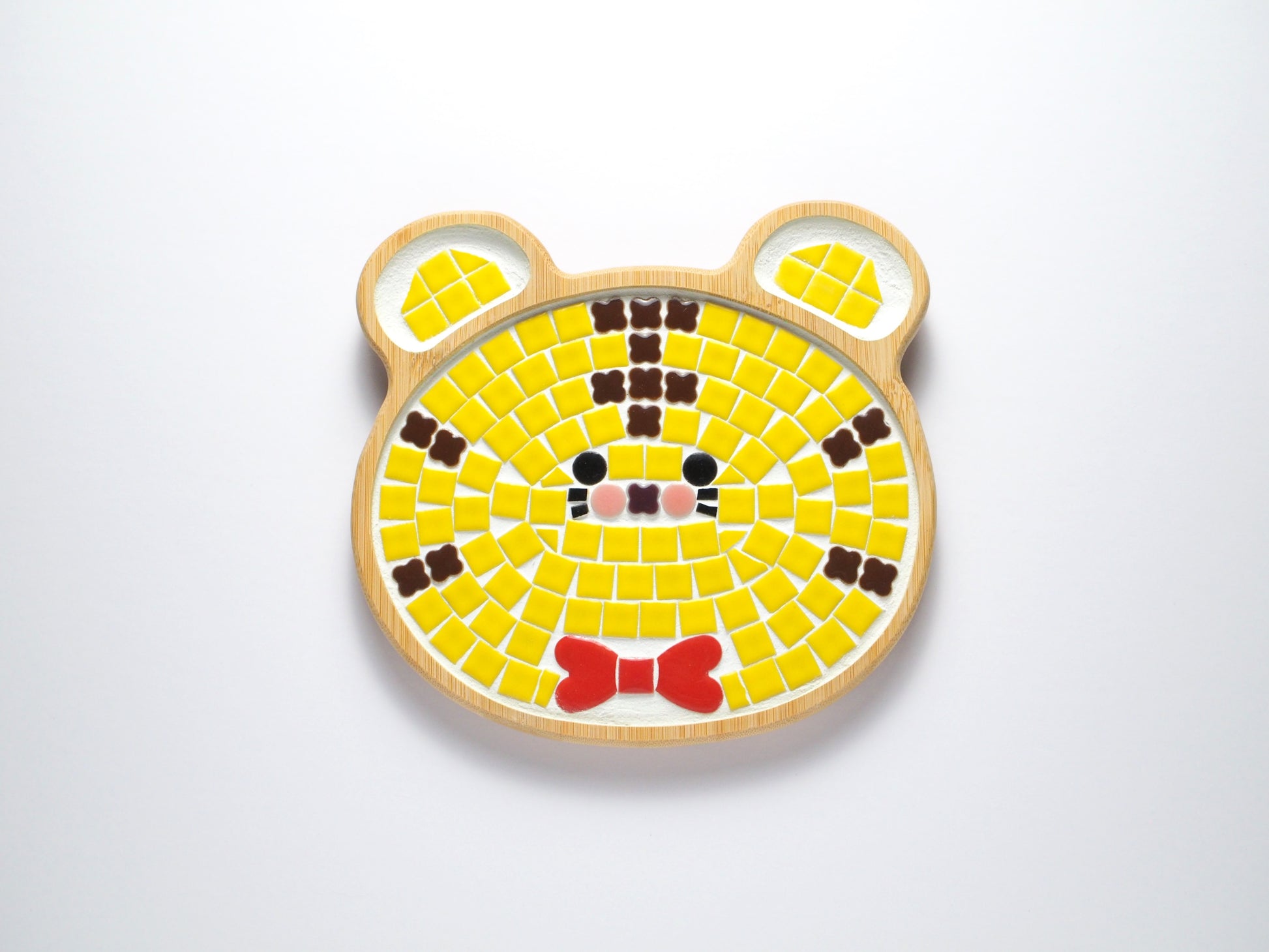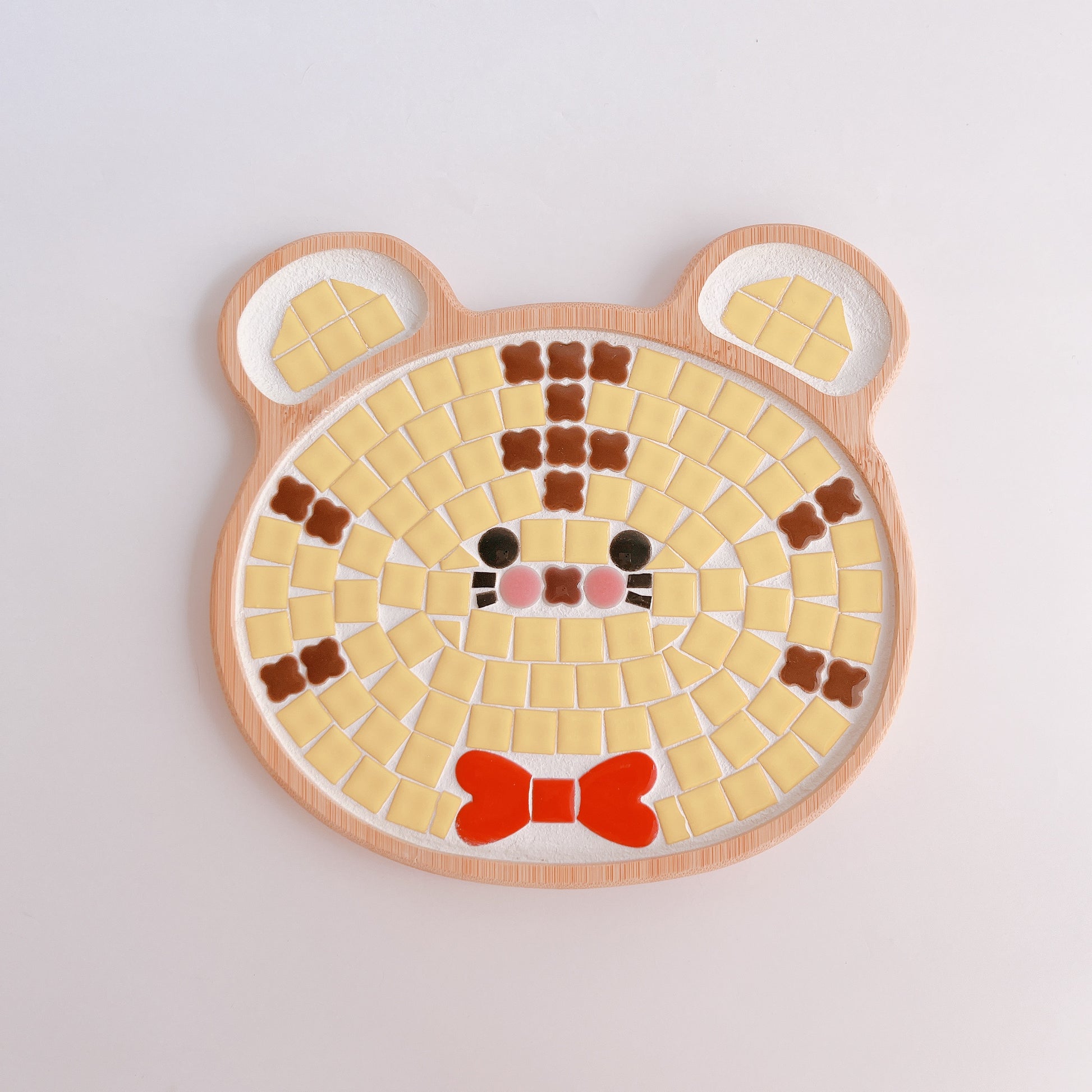 This is a tile art tiger trivet. It features a cute tiger design. The red bow tie is the highlight. If you think it's too cute to put a pot on, you can use it as a plate to put cups or sweets on.