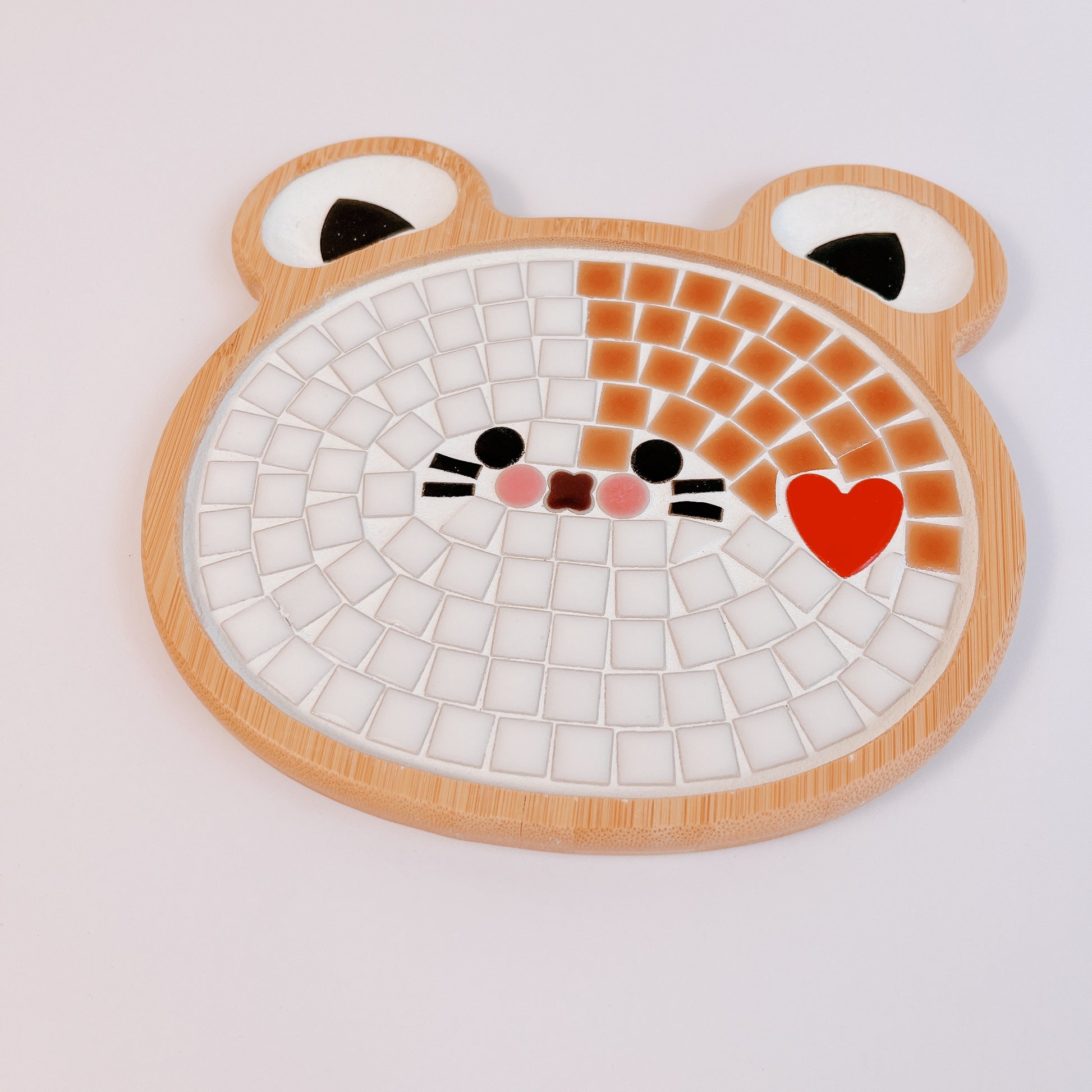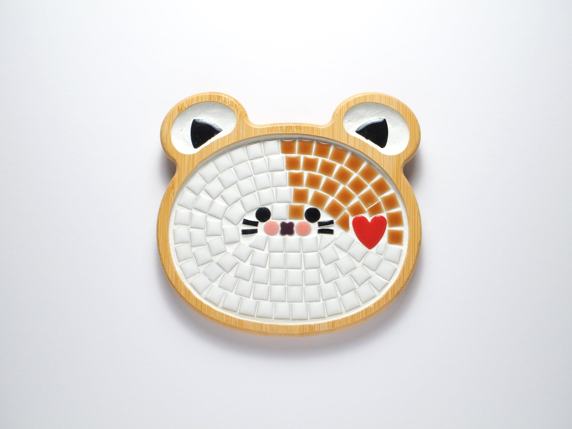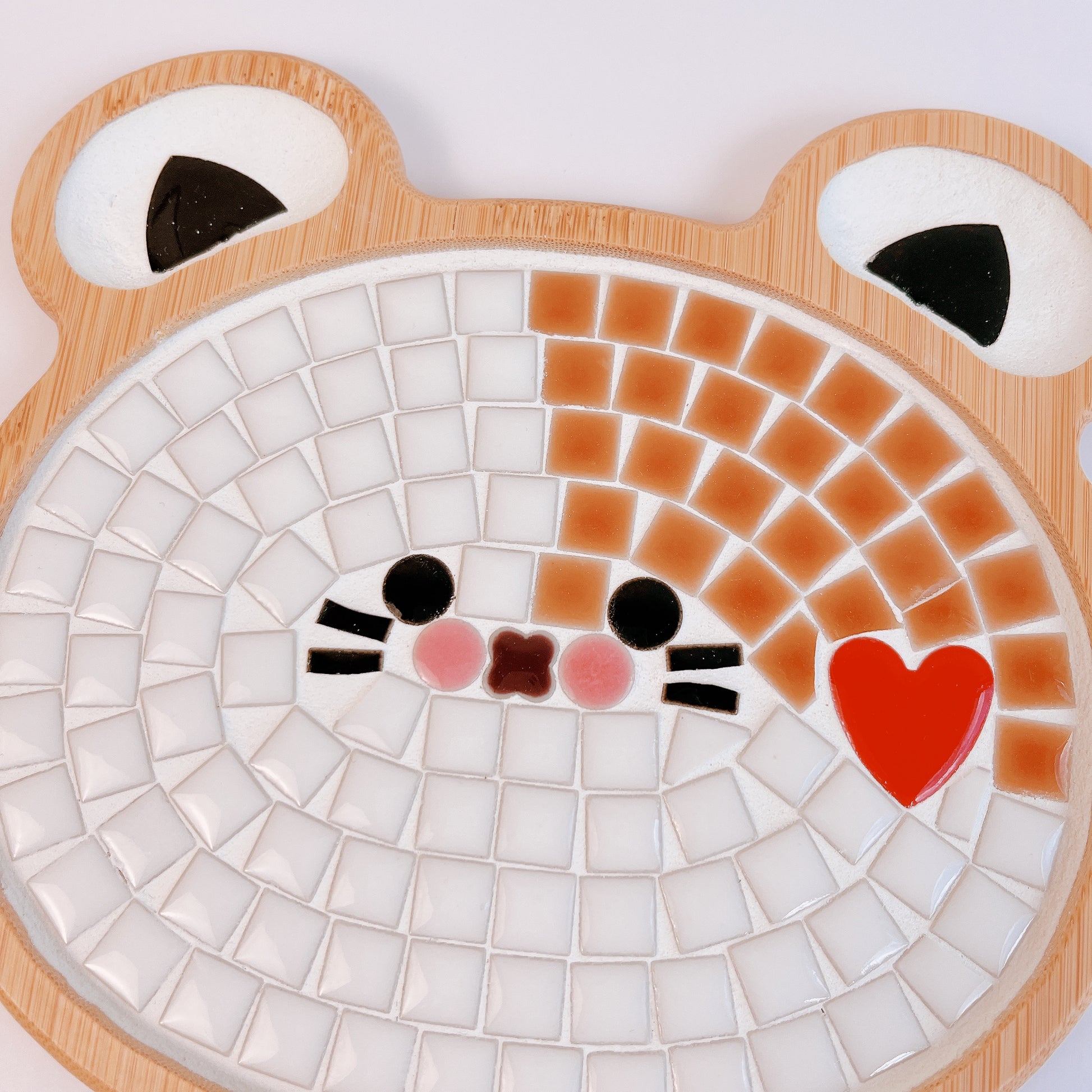 Chobo's tile art goods are made by hand, gluing tiles one by one and filling in the gaps. In some cases, tiles are cut to create a design, so the arrangement of tiles may vary from piece to piece.