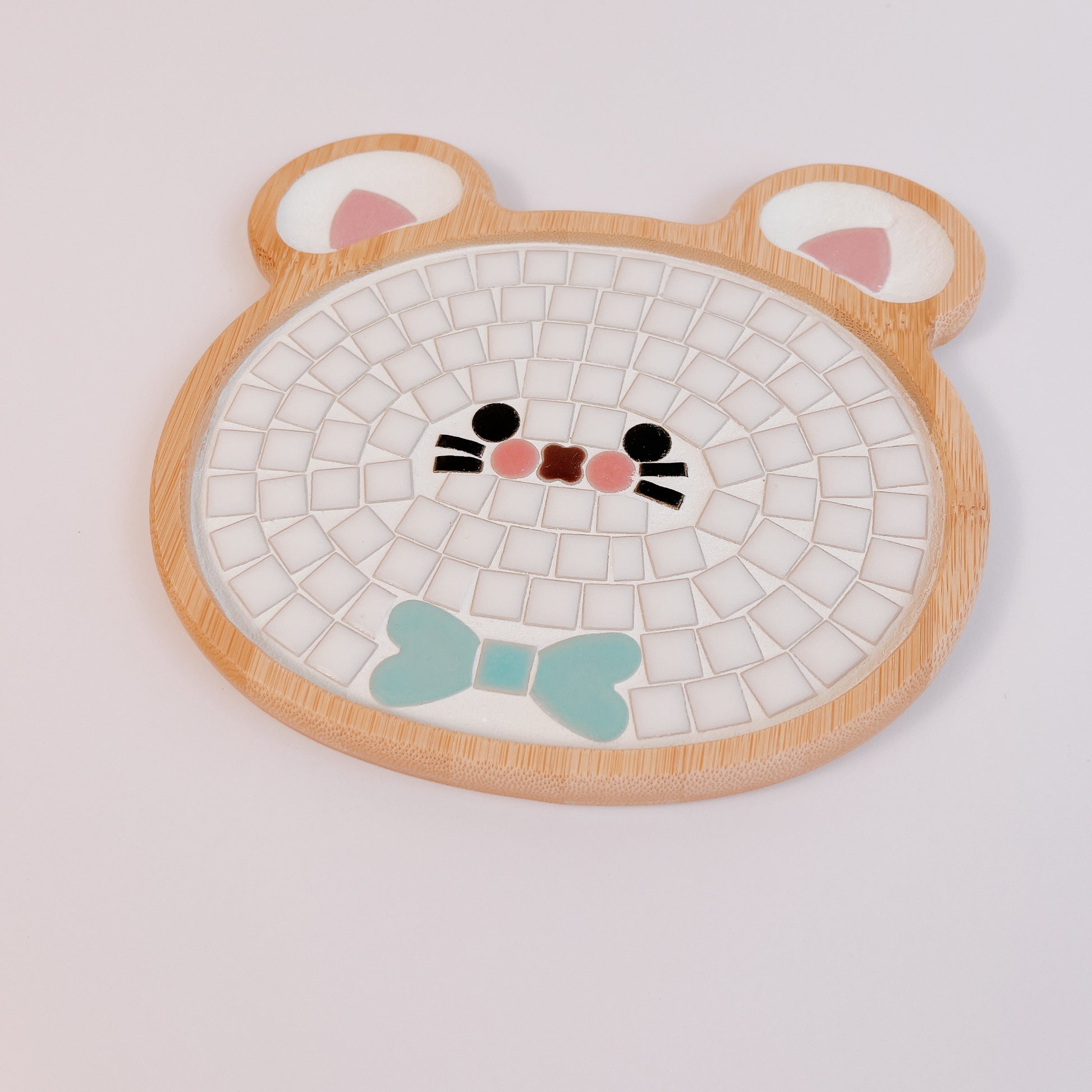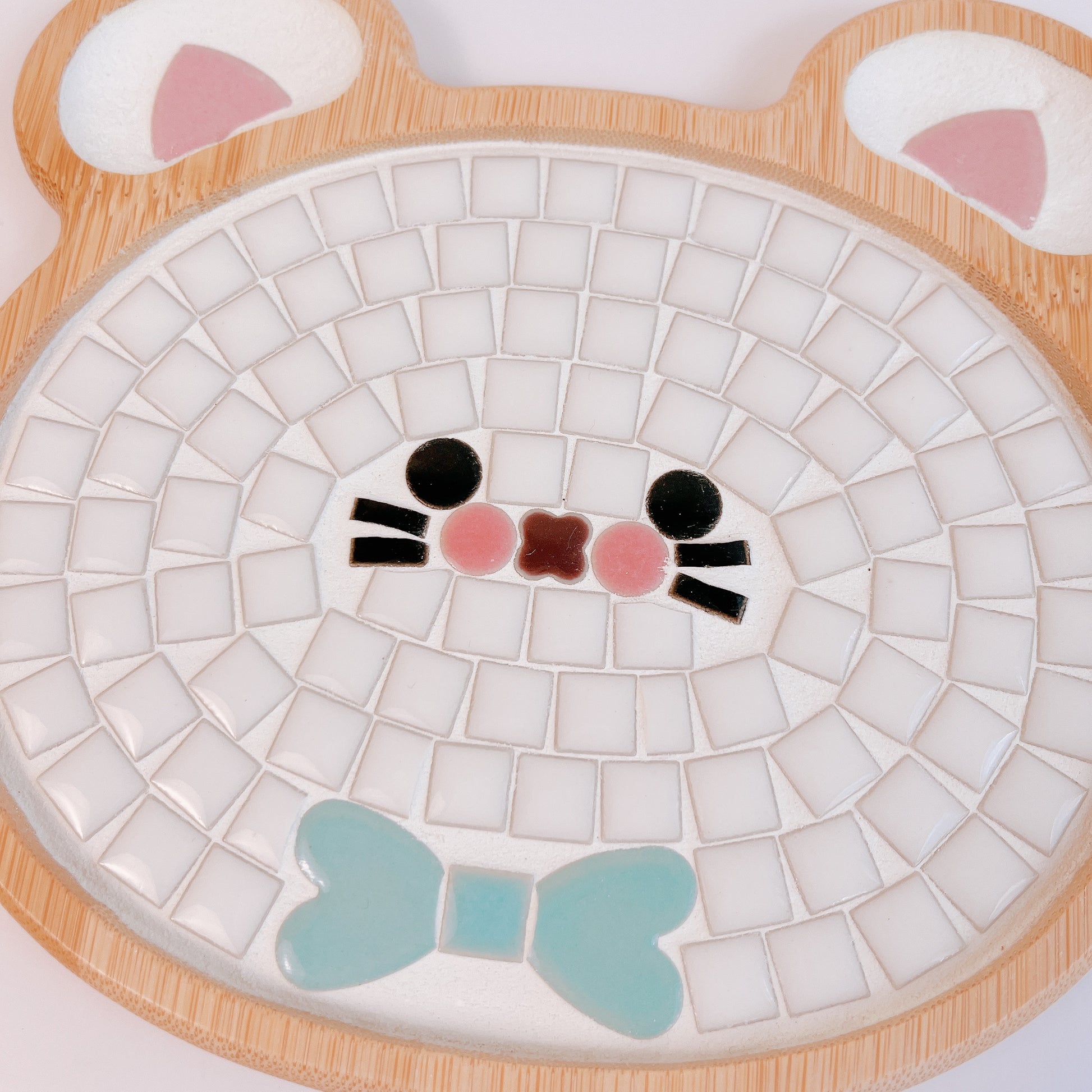 This is a tile art trivet with a white cat design. The pink ears give it a cute look. It can be used as a plate to hold cups and sweets, or as a place to put small items.