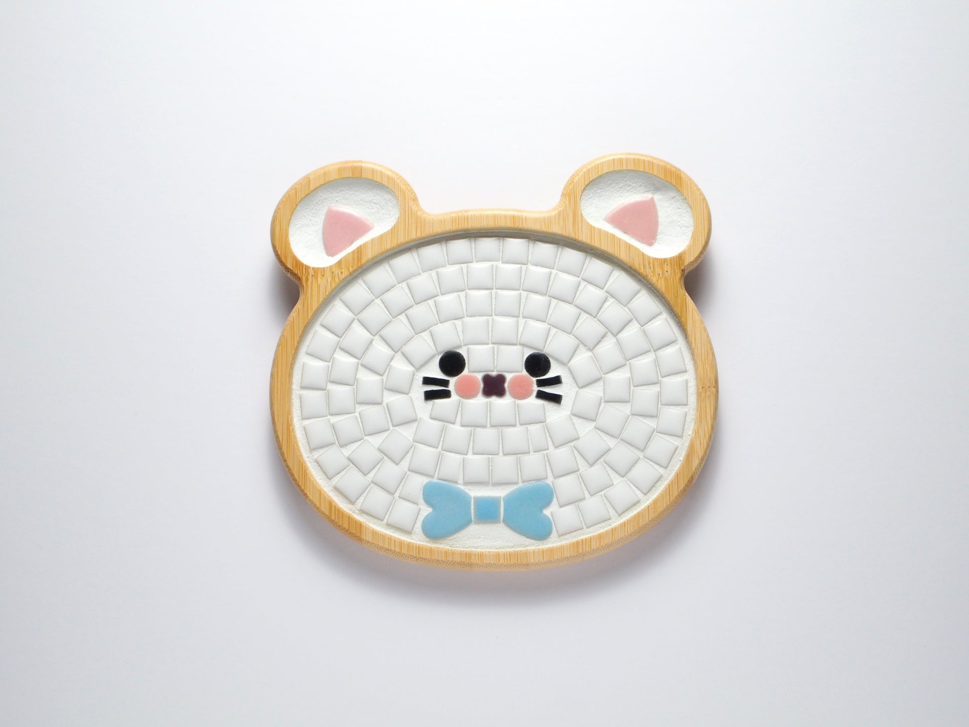 Chobo's tile art goods are made by hand, gluing tiles one by one and filling in the gaps. In some cases, tiles are cut to create a design, so the arrangement of tiles may vary from piece to piece.