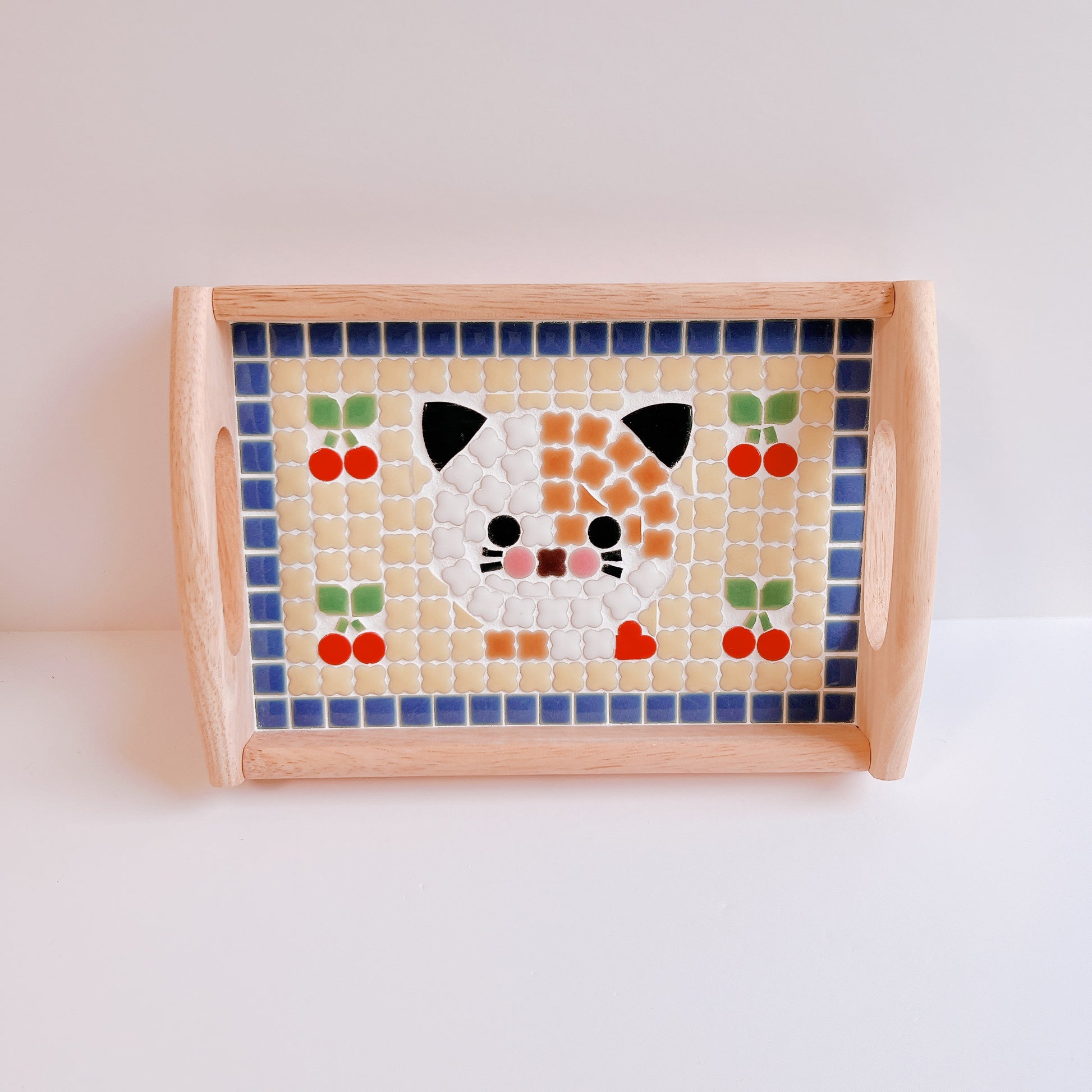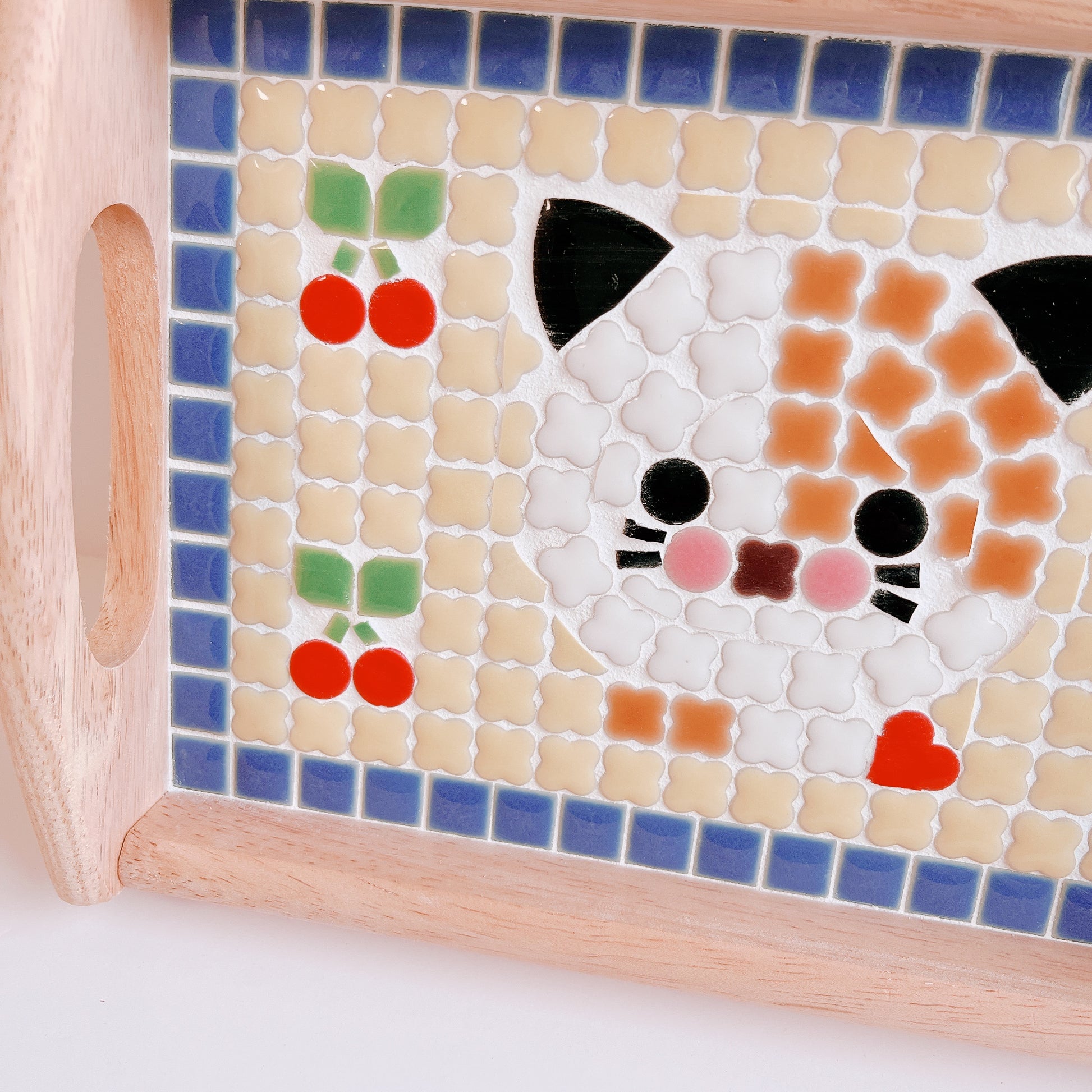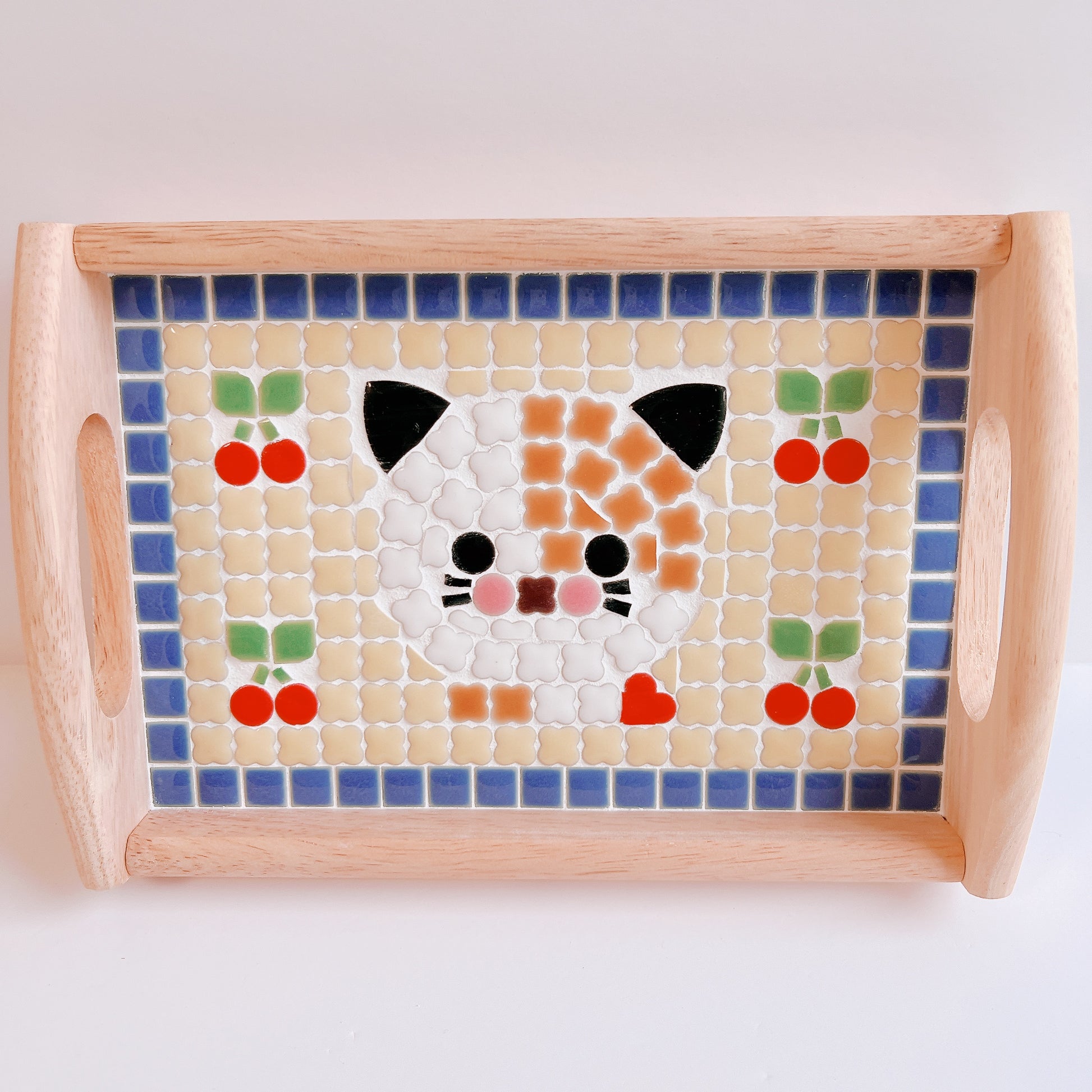 タイルアートのカフェトレイです。三毛猫、さくらんぼのデザインのトレイです。チェストやデスクの上に置くだけで可愛らしい雰囲気になります。