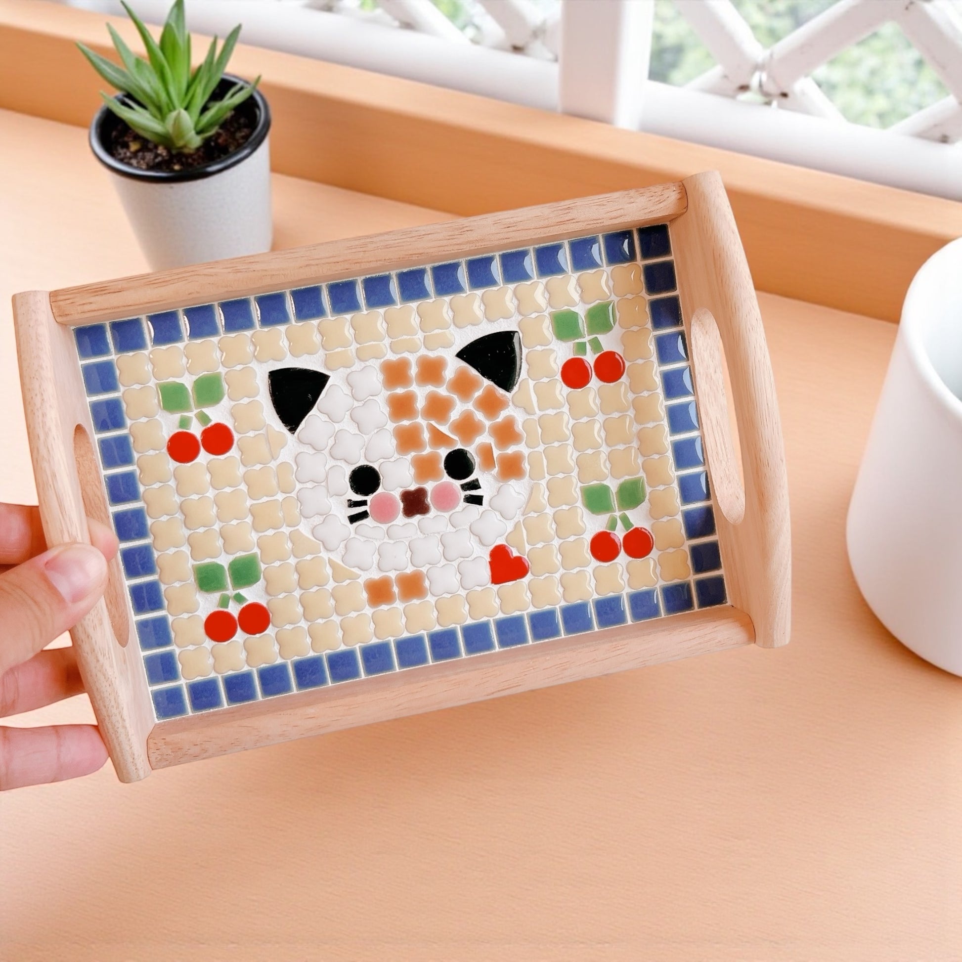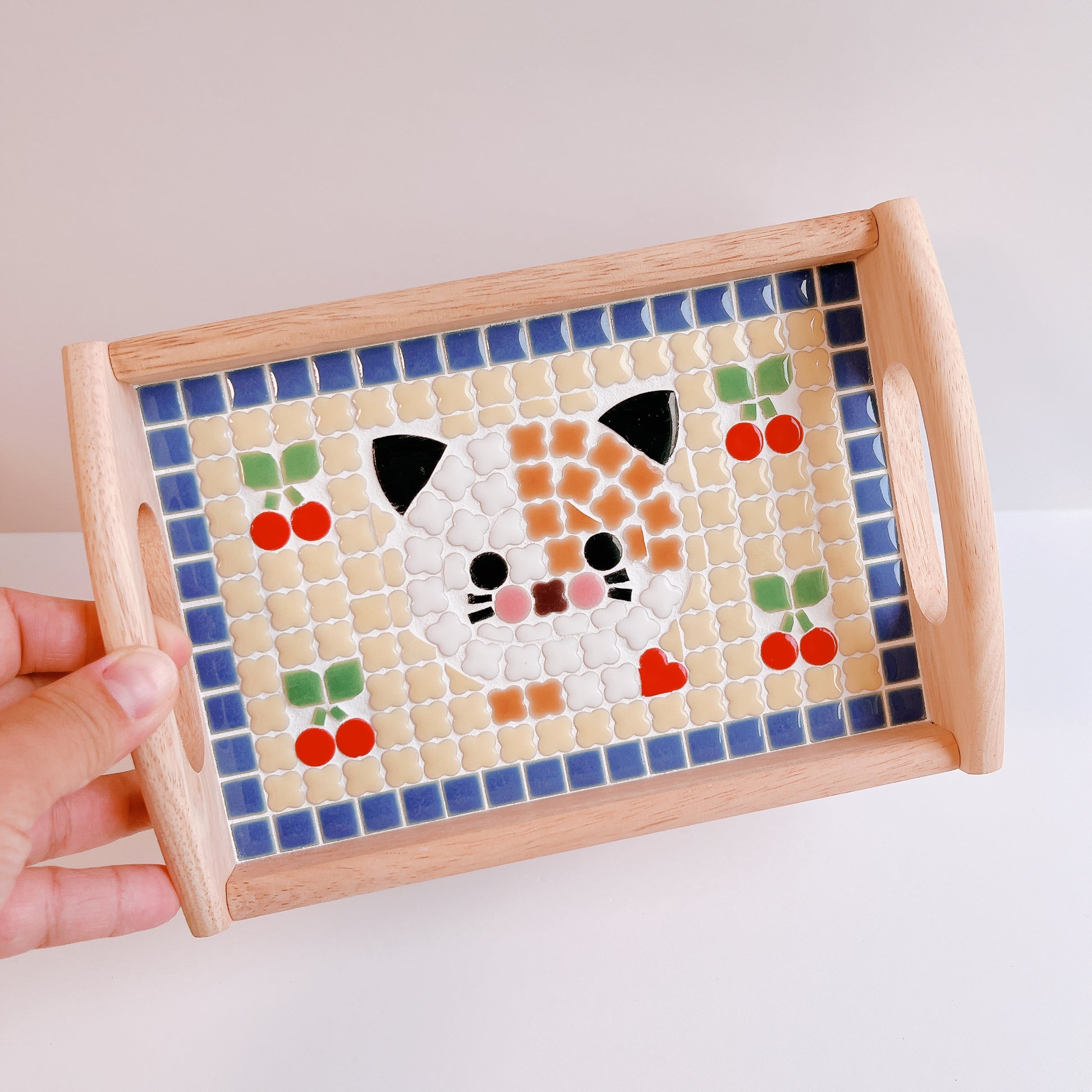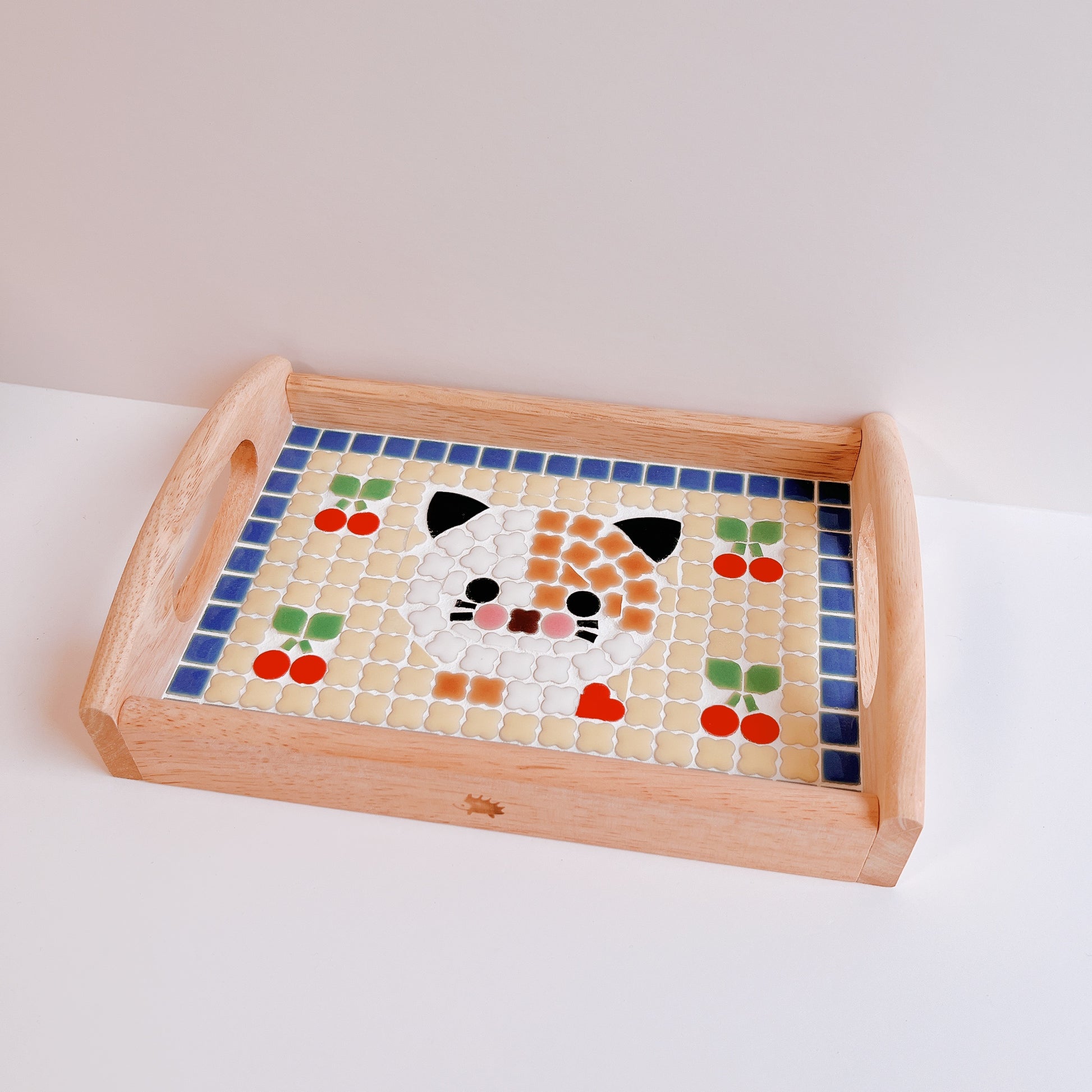 タイルアートのカフェトレイです。三毛猫、さくらんぼのデザインのトレイです。チェストやデスクの上に置くだけで可愛らしい雰囲気になります。