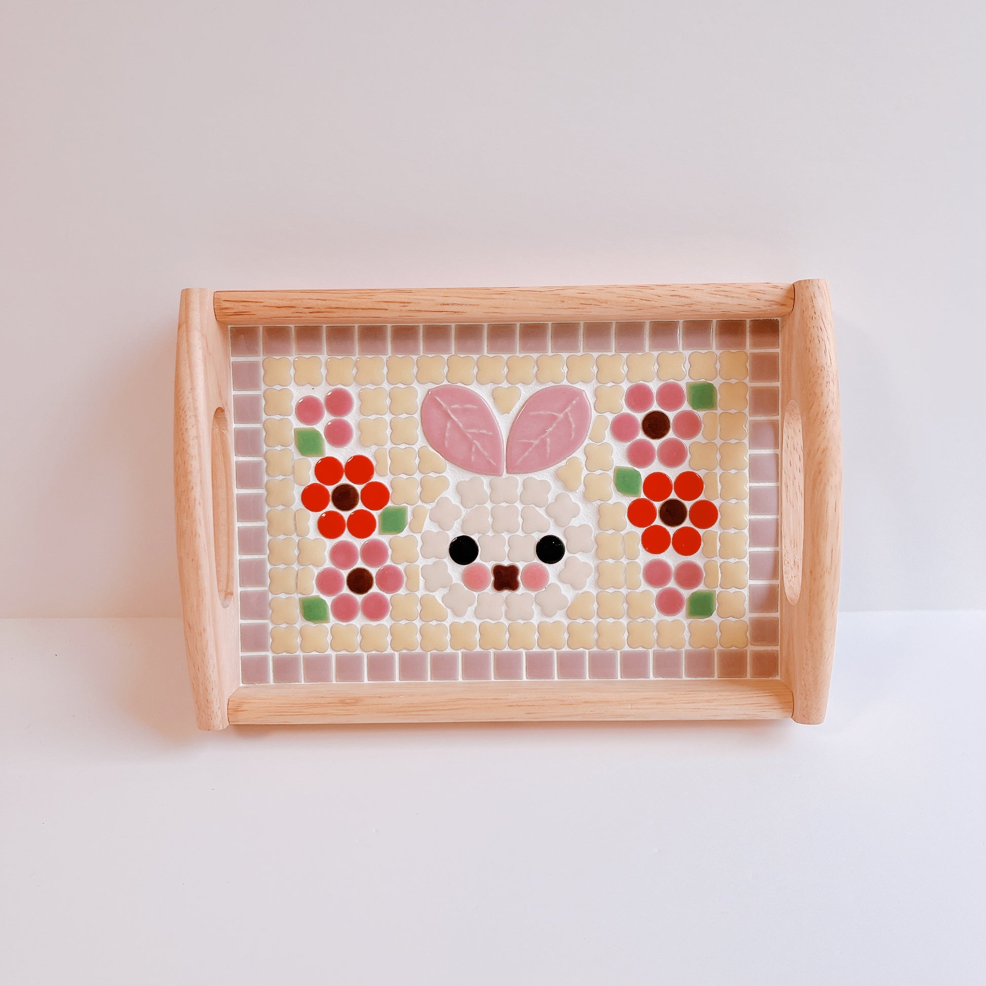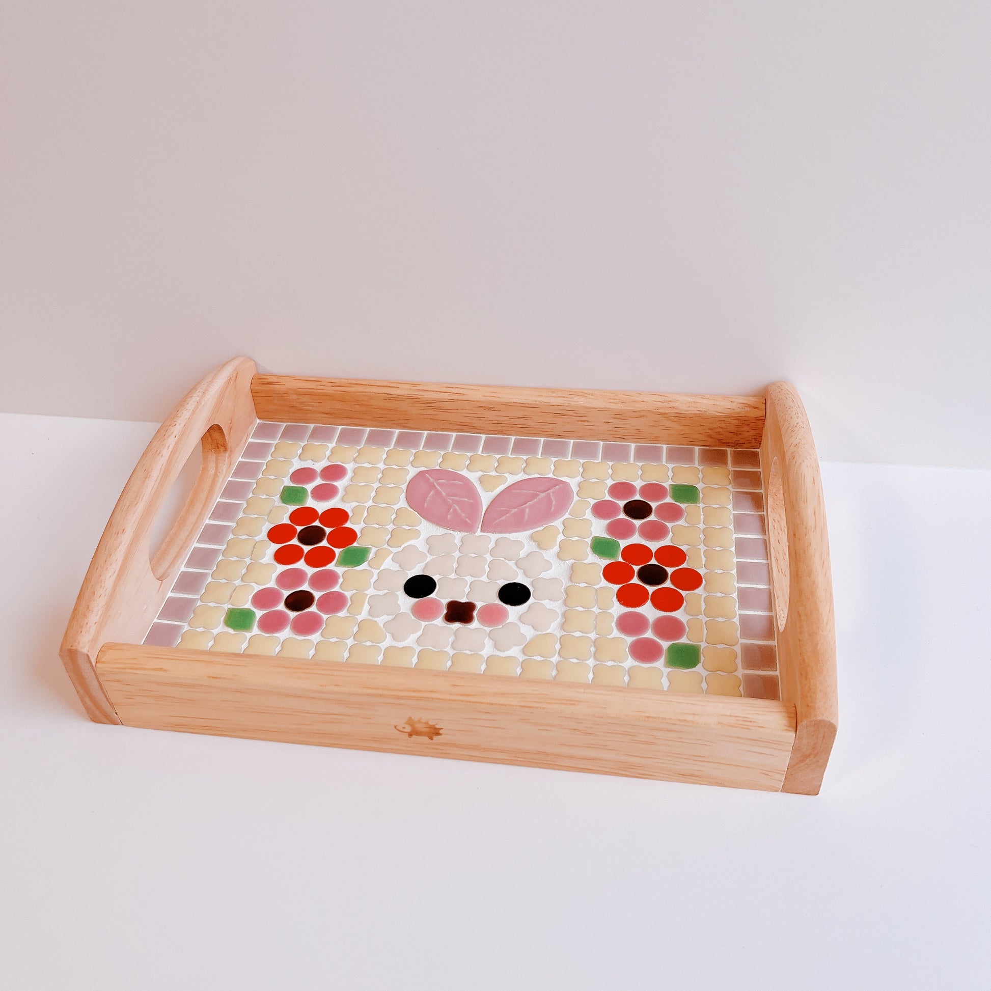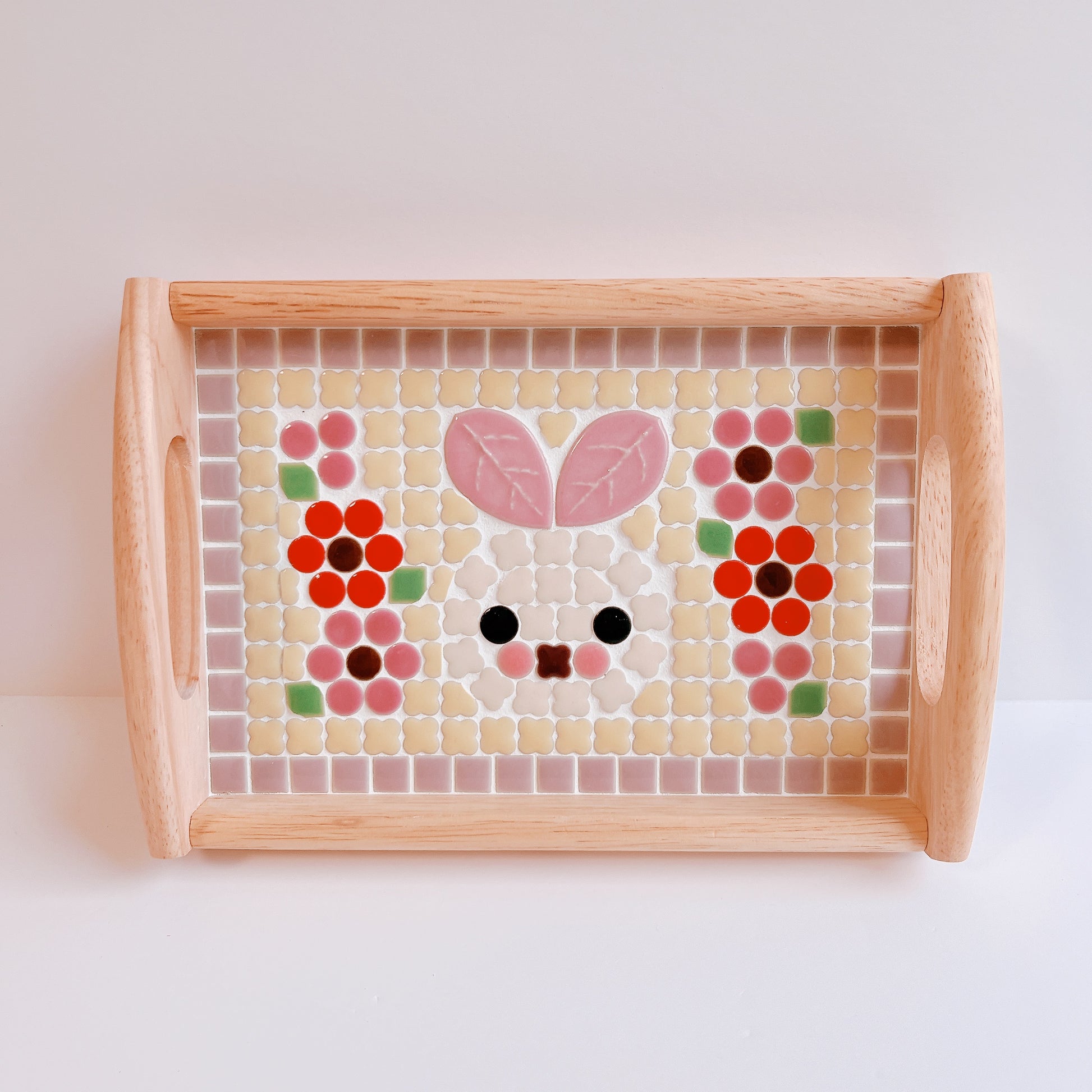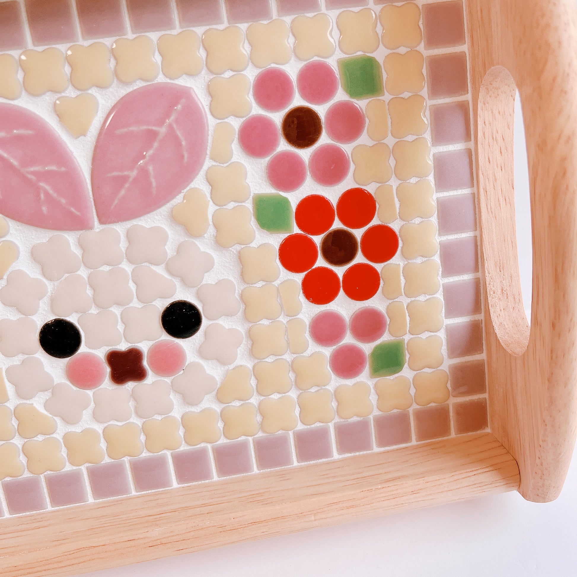 タイルアートのカフェトレイです。うさぎ、お花のデザインのトレイです。チェストやデスクの上に置くだけで可愛らしい雰囲気になります。