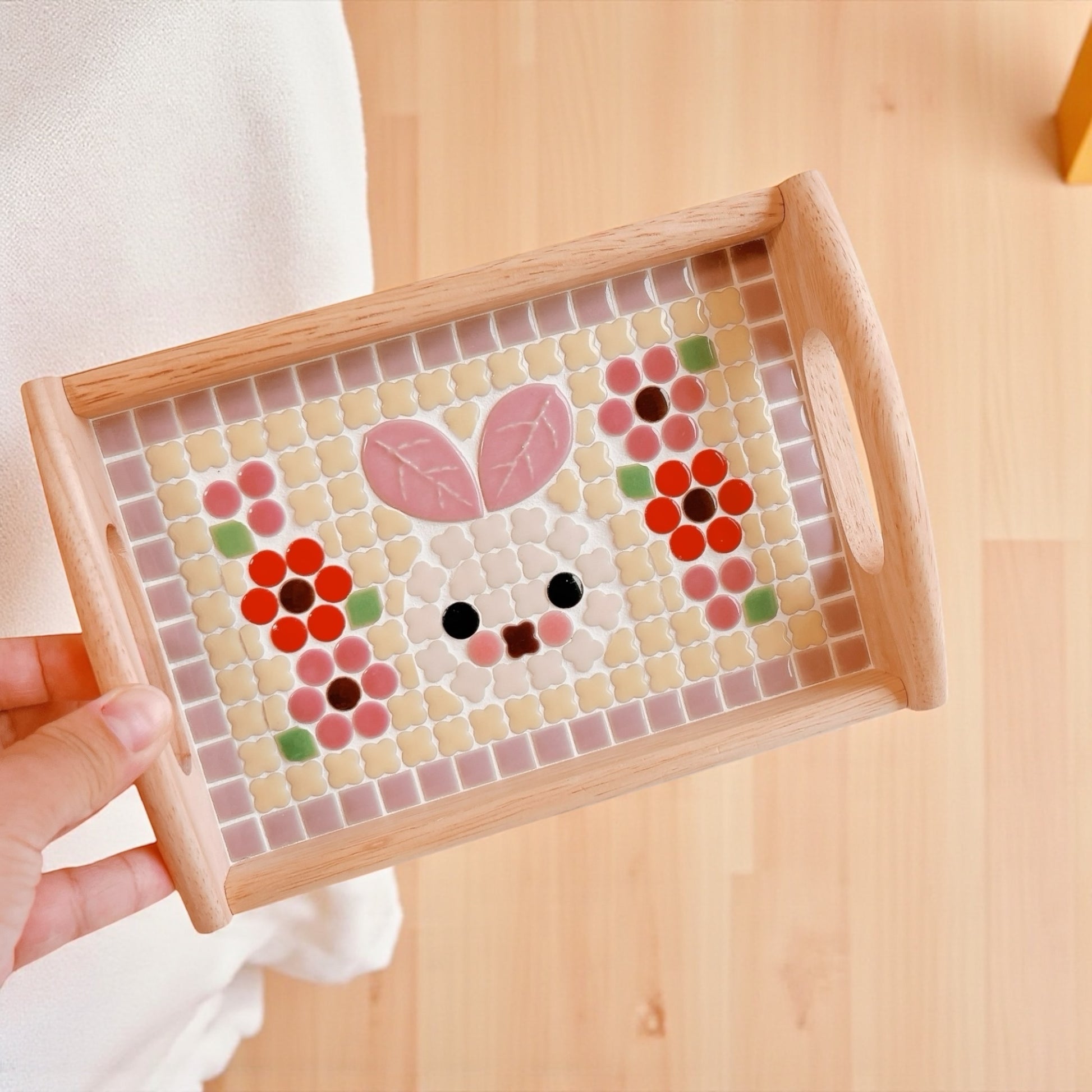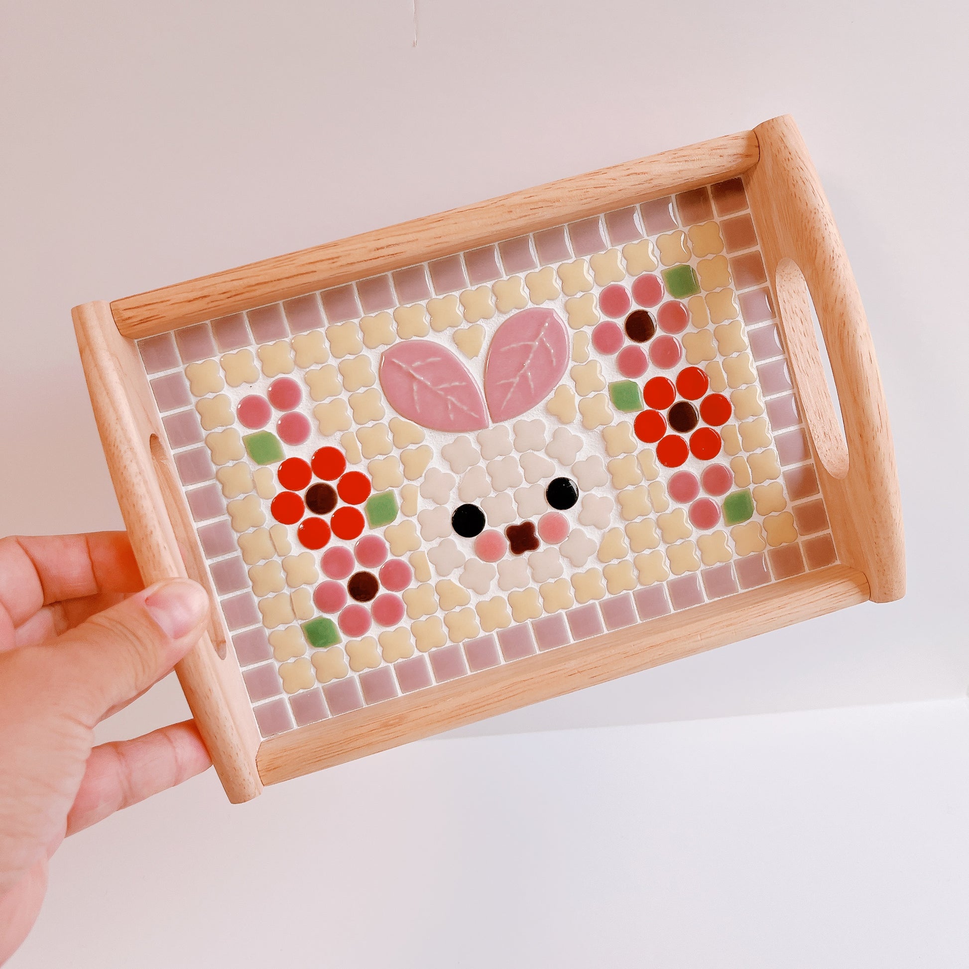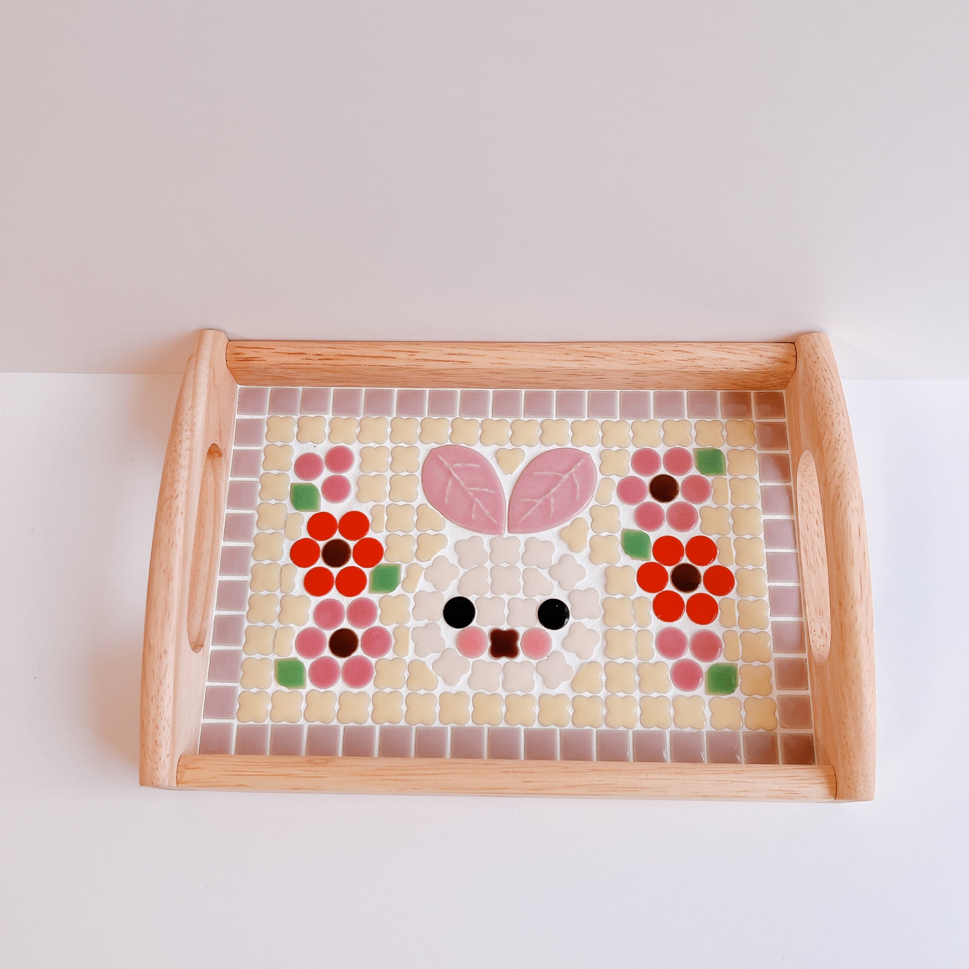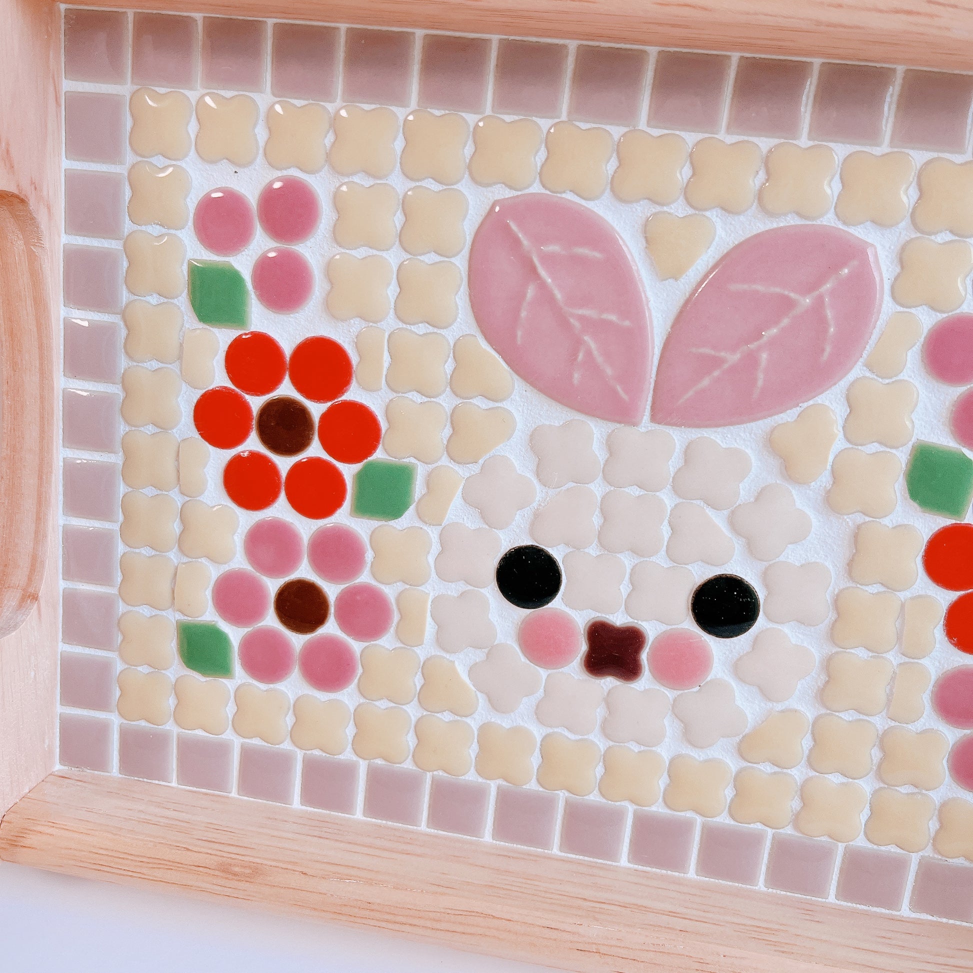 タイルアートのカフェトレイです。うさぎ、お花のデザインのトレイです。チェストやデスクの上に置くだけで可愛らしい雰囲気になります。