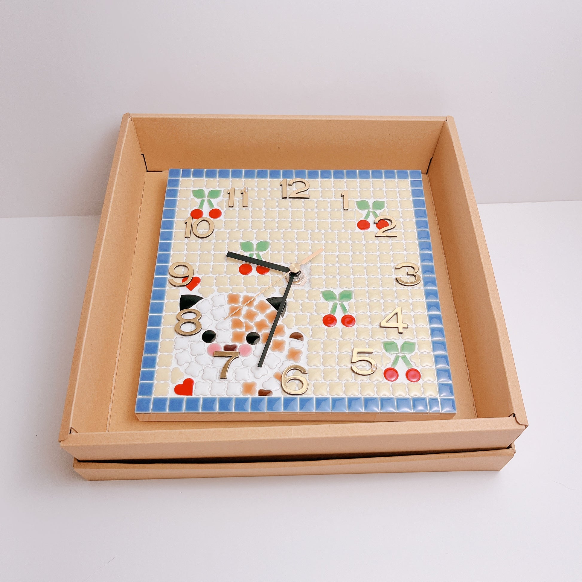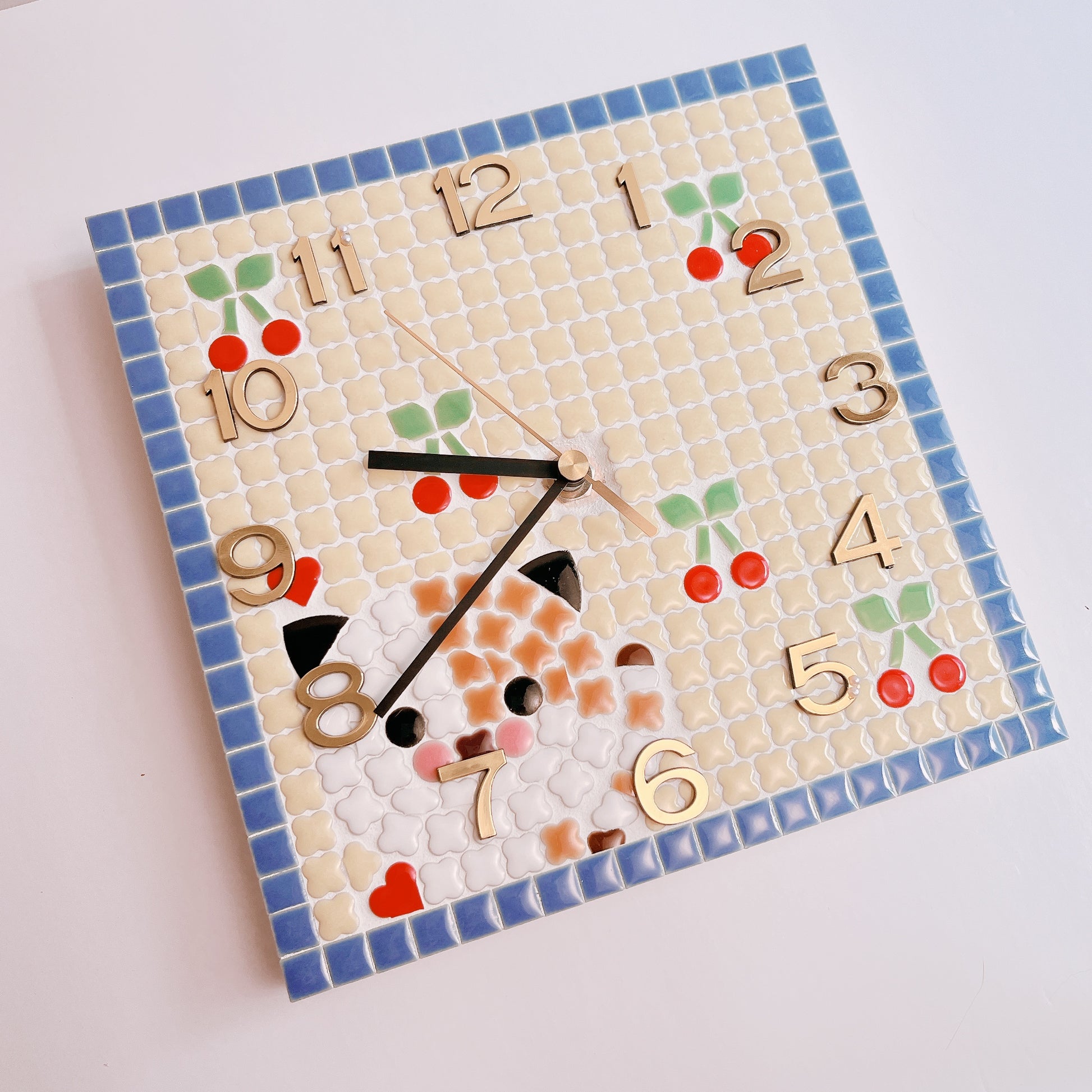 This is a tile art wall clock. It has a blue frame with a pale yellow background, and a pop design of a cat and cherries. The numbers are gold and the hands are white. The clock uses a sweep-type quartz electronic clock that does not make ticking noises.