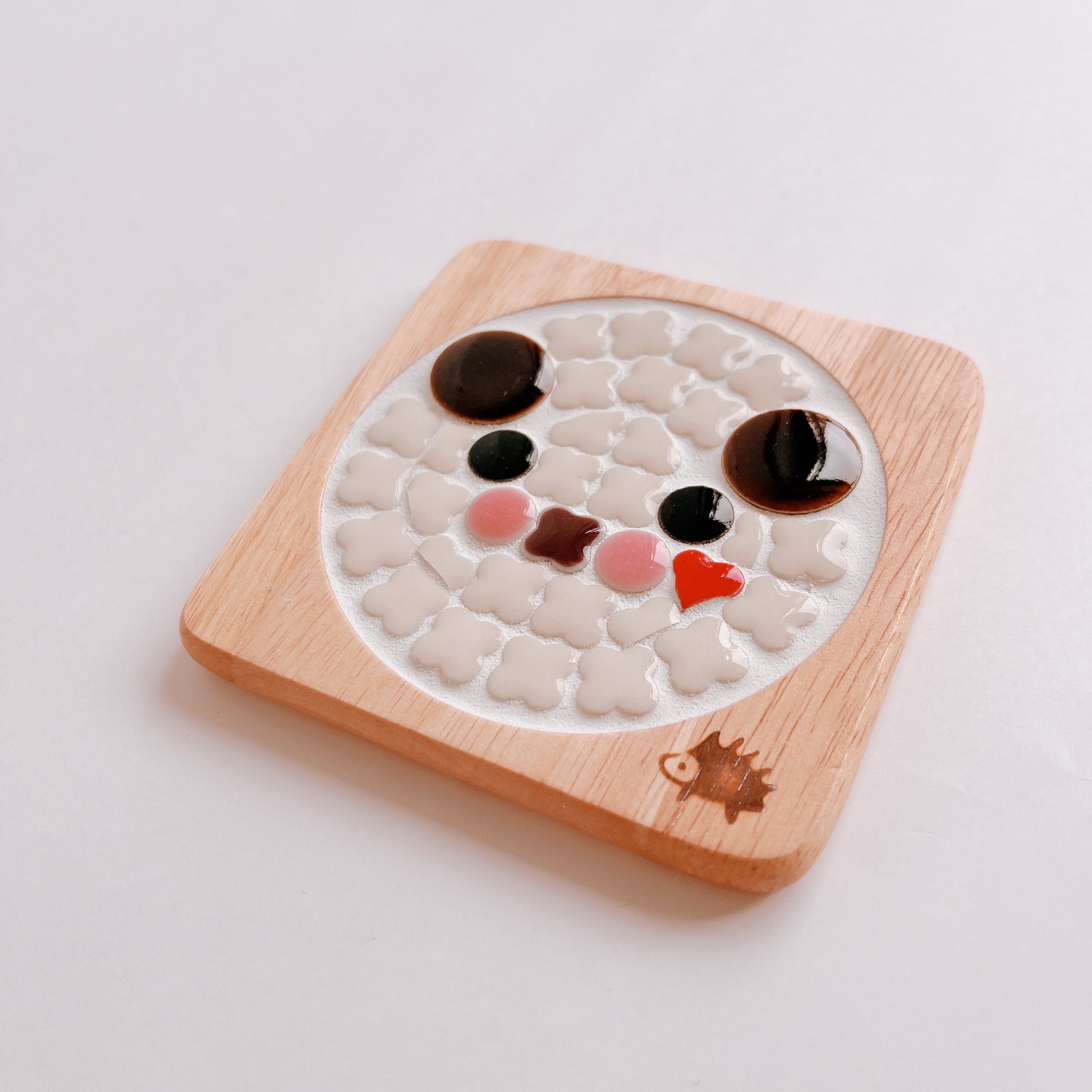 This is a tile art coaster. It features a polar bear design with brown ears and a beige face. The color scheme is gentler than the brown bear, and the bear set makes a perfect gift.