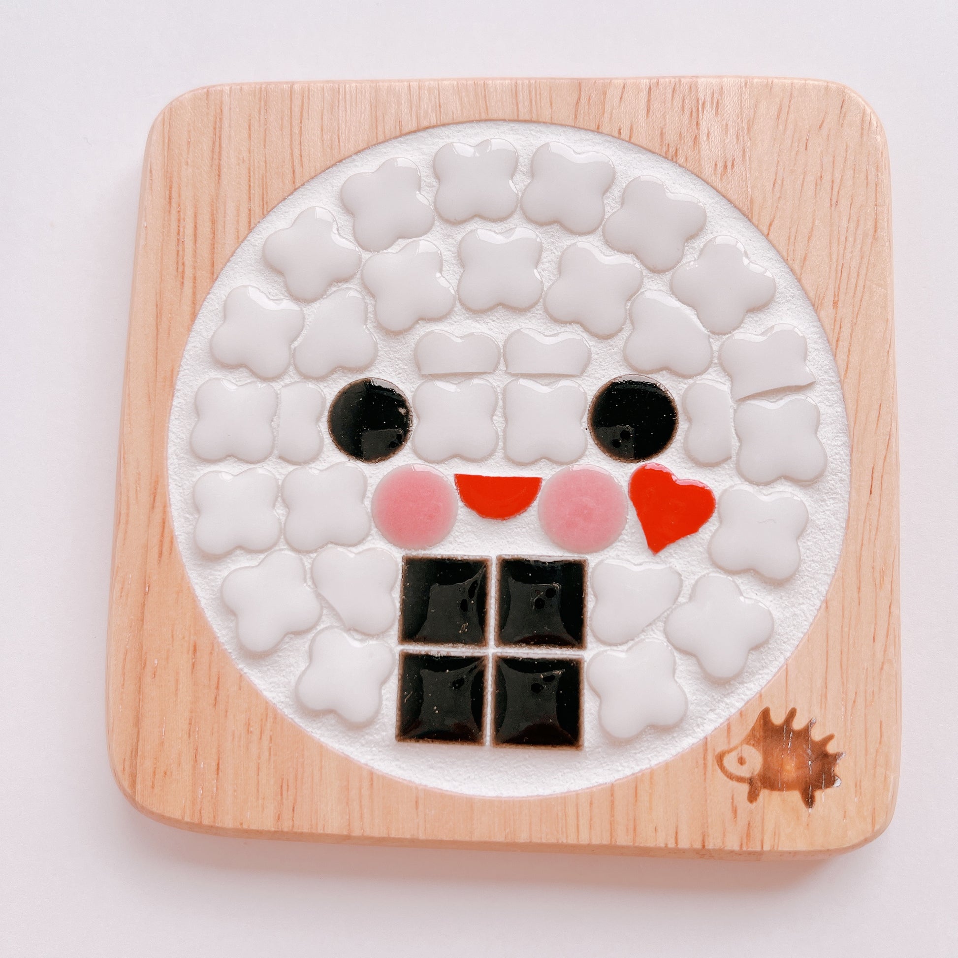 This is a tile art coaster. It is a design of rice ball. It is a simple salted rice ball with a square piece of nori seaweed, and the round face is cute. If you prefer rice for breakfast, use this onigiri coaster to have a healthy and fun breakfast. It is also recommended for children.