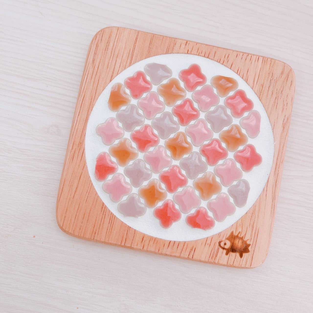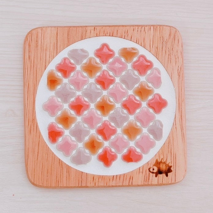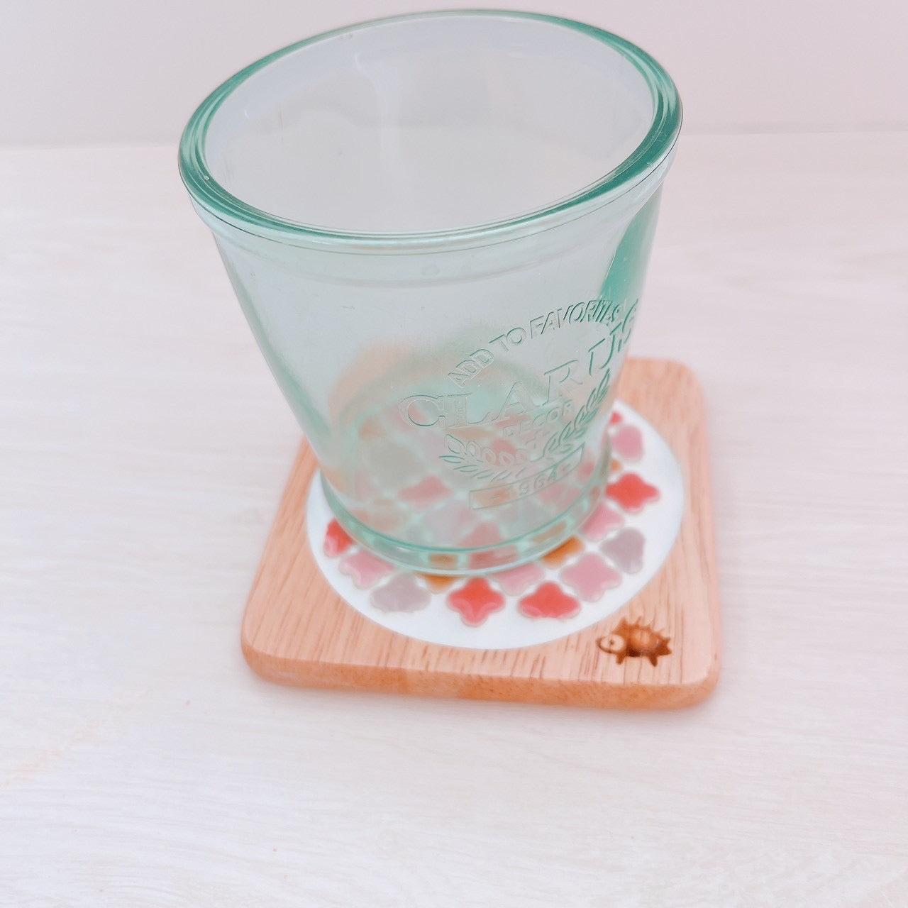 こちらはタイルアートコースターです。ポップでありどこかレトロな雰囲気のあるピンクと茶を基調としたモザイク柄のデザインです。ご家族へのプレゼントにもぴったり。