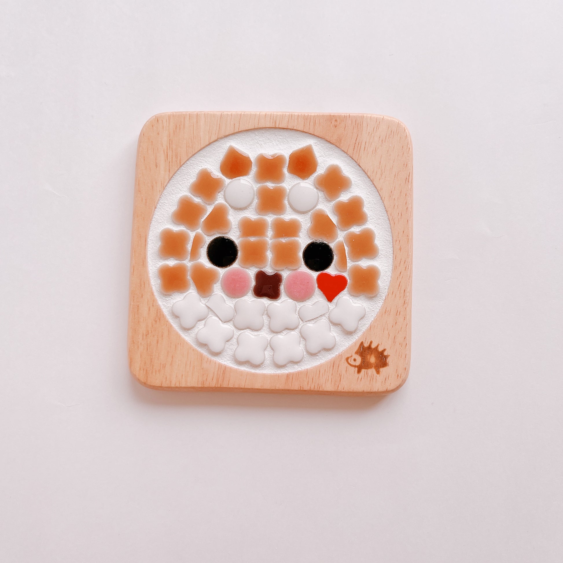 This is a tile art coaster. It has a Shiba Inu design. The ears are made by cutting square tiles. The white circle on the forehead is definitely a Shiba Inu. Recommended for dog lovers, it also makes a great gift.