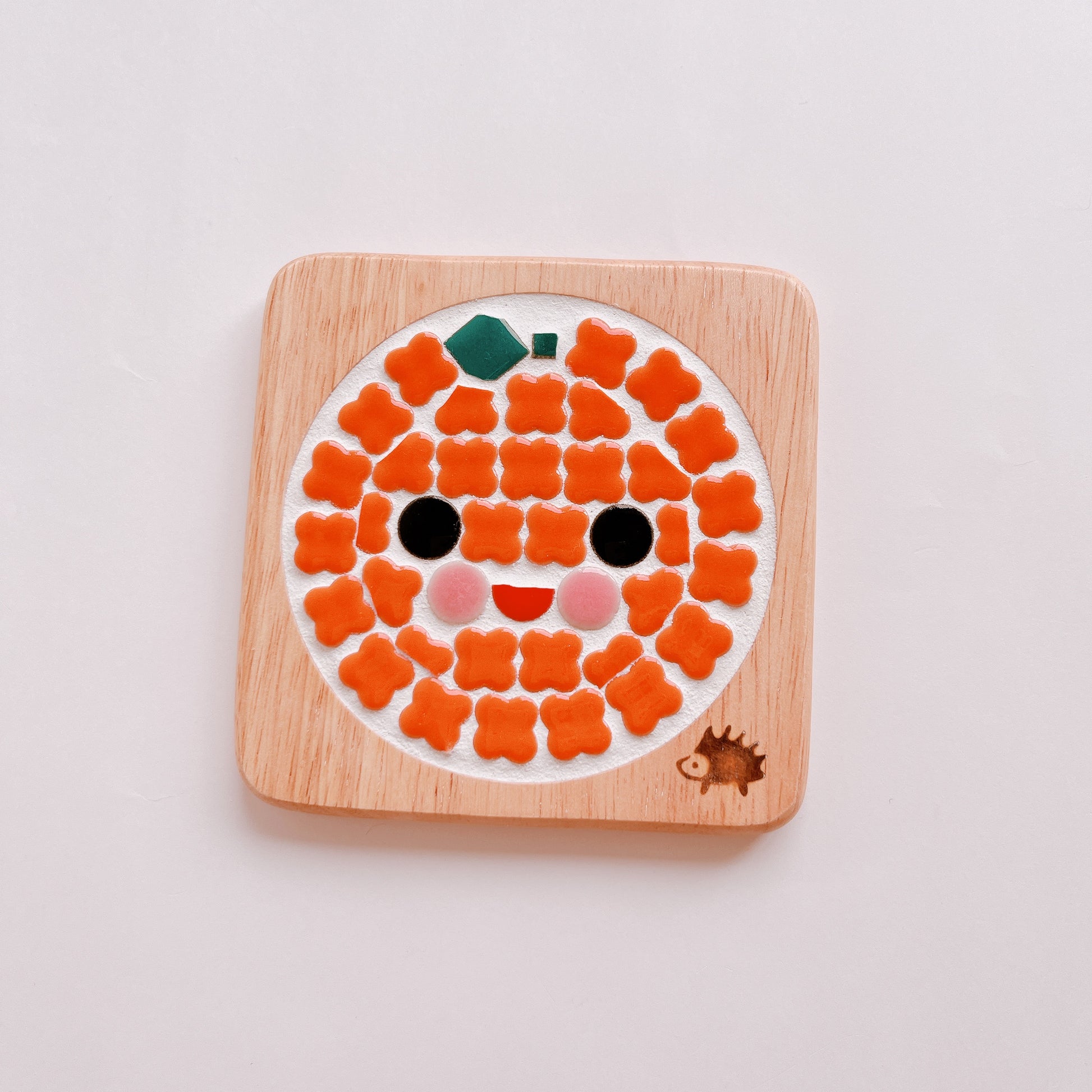 This is a tile art coaster. It has a mandarin orange design. The green leaves are cut from square tiles. The food series is perfect for the dining table. The bright orange color of the mandarin oranges really stands out.