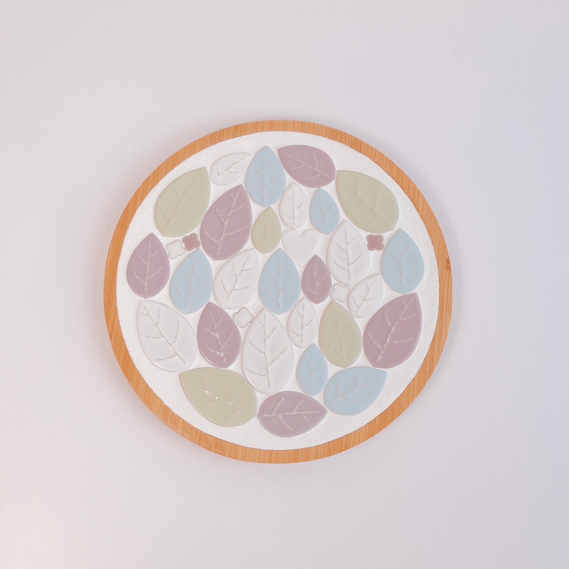 This is a tile art trivet. It is a simple yet striking design using leaf-shaped tiles of different sizes. A heart-shaped tile is added as an accent. The refreshing and cool colors will decorate your dining room or kitchen in style.